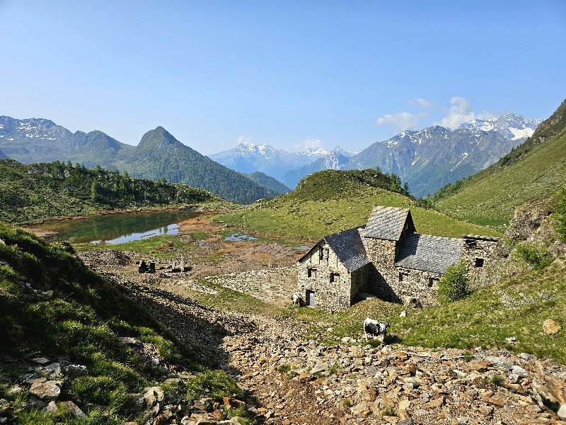 Also Rucksack geschultert und weiter hoch. Weiterhin im guten Tempo erreichte ich dann die wunderschön gelegene Hochalm am Fuß des Hochwart. Ein wundervolles Panorama lässt sich hier begutachten – Sarntaler Alpen, Texelgruppe, einfach grandios. Dazu Sonnenseite, ein traumhafter Platz hier oben.