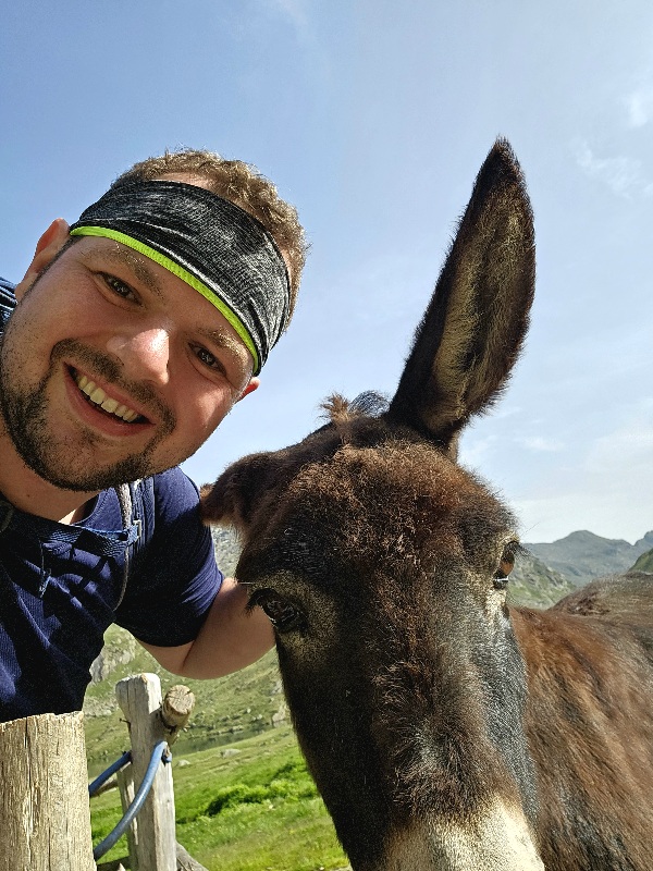 Besonders schön war die Nacht in der Koje jetzt nicht unbedingt, aber manchmal muss man sich in den Höhenlagen mit dem zufrieden geben, was halt da ist. Morgens gab es noch Selfies mit dem Esel der Alm – dieser ist seit einigen Jahren quasi Bestandteil der Kuhherde und geht inzwischen auch überall dort mit hin, wo die Kühe hingehen. Heißt also, wenn das Melken ansteht, ist Esel auch im Stall dabei und schaut zu.