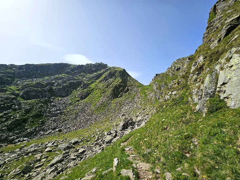 Also Stöcke raus und runter. Inzwischen laufe ich sowas viel lieber hoch, auch wenn es natürlich konditionell deutlich anstrengender ist. Aber sowas bergab ist nicht nur körperlich sehr anstrengend, sondern auch vom Kopf. Man muss ständig konzentriert sein, die Füße wohlüberlegt setzen, dazu auch die Stöcke. Gefälle einschätzen, auf lose Steine achten und jederzeit bereit sein, sich abzufangen. Im Gegensatz zum Aufstieg will das komplette Gewicht inkl. Rucksack nach unten und kann durchaus eine interessante Eigendynamik entwickeln. Dazu geht es auch noch richtig böse auf die Knie. Also ganz vorsichtig nach unten arbeiten und dann war auch das heikle Zickzack geschafft. Rückblickend war das einer der steilsten Abstiege, die ich bisher gelaufen bin.