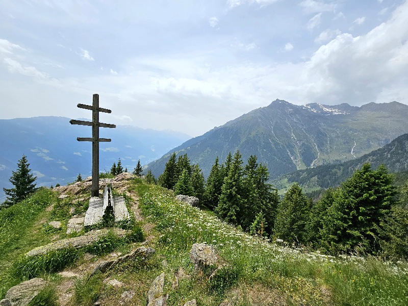 Danach ging es in den Wald, auf einer Bank lockerte ich die Knie und genoss endlich wieder Empfang, so dass ich ein Lebenszeichen absenden konnte, dass ich lebend den Schnee verlassen habe. Es ging zwar weiter steil runter, aber der Waldweg war insgesamt angenehmer. Weiter unten gelangte ich auf eine Kreuzung und das erhöhte Aufkommen von Mitwanderern wies schon daraufhin, dass ich auf den Meraner Höhenweg nun war. Hier verirren sich auch viele Tagestouris hin, für die ich mit meinem Riesenrucksack immer eine Attraktion darstelle. War der Weg am Anfang durch den vielen Wald durchaus angenehm, wurde er zunehmend langweiliger. Ab und zu riss es mal auf und man konnte ins Vinschgau schauen.