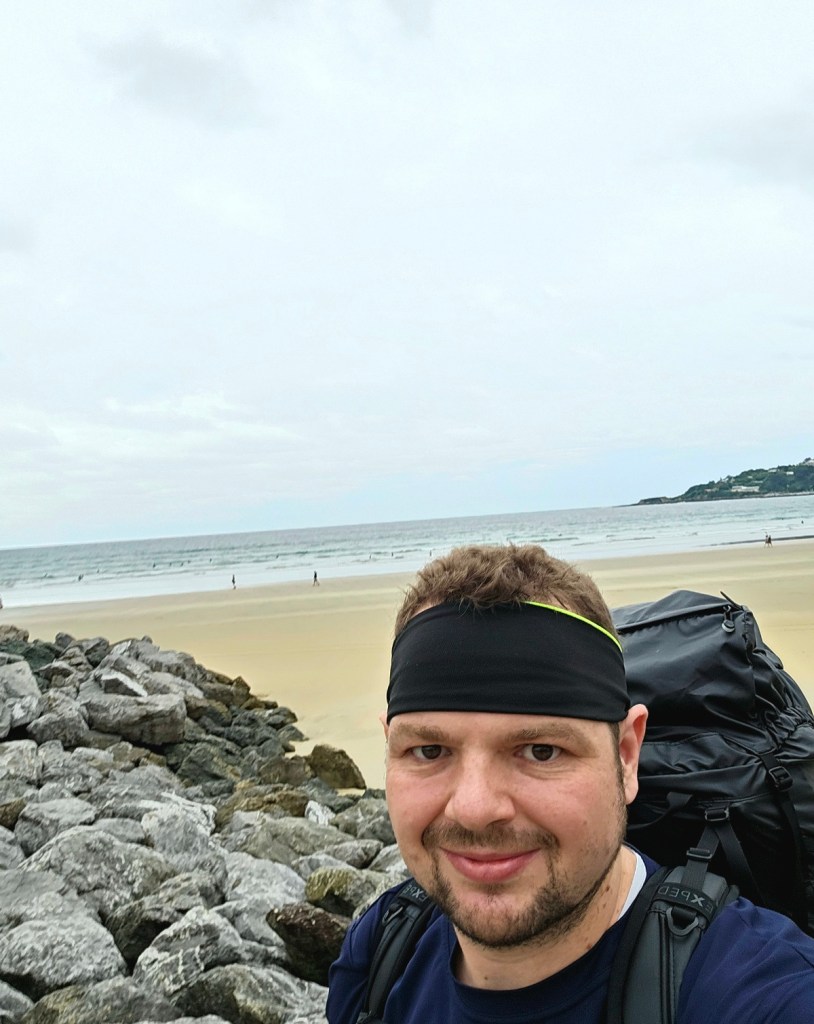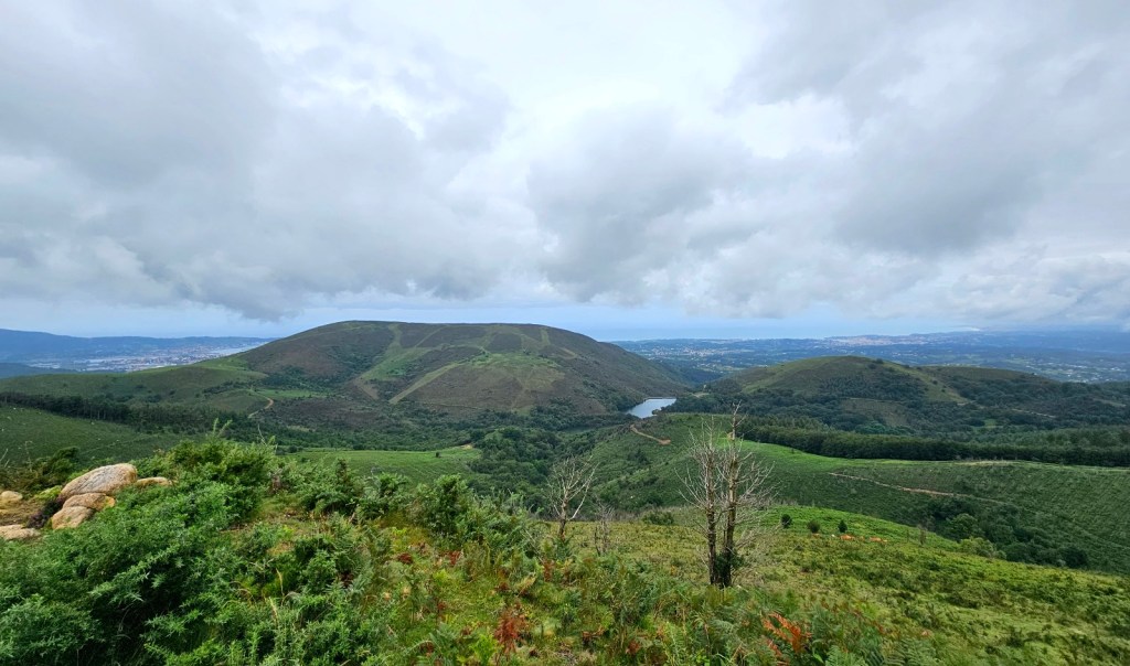Fix nochmal zum Atlantik, Startfoto und dann auf. Was ich direkt schon merkte – ohne GPS-Navigation ist man völlig verloren, es gibt kaum Wegweiser. Ein Hich auf die intensive Planung, denn so ging es flott aus der Stadt heraus. Und während es am Meer windete und kühl war, gab es nun gefühlte 100% Luftfeuchtigkeit bis zum Ende. Innerhalb kürzester Zeit waren sämtliche Klamotten durch, es tropfte aus allen Poren. In der Nacht gab es ordentliche Schauer, die Wege dementsprechend schlammig. Die guten neuen Schuhe direkt für alle Zeiten versaut. Aber die Umgebung war wundervoll – grüne Hügel, wohin das Auge reichte. Nebelschwaden um die ersten Gipfel. Und so stampfte ich die Kilometer nach und nach durch. Nach 14km in 3 Stunden die erste kleine Pause und der letzte Blick auf die Atlantikküste.
