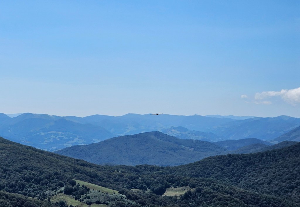 Der Anstieg wartet und der Kampf gegen den Berg sowie gegen die Sonne beginnt. 300 Höhenmeter klingen nicht viel, an meinem Hausberg laufe ich die in 35min – aber halt ausgeruht und ohne Gepäck. Und ja, auch wenn er für meine Verhältnisse recht leicht ist, merkt man ihn eben auch. Schulter und Rücken sehnen sich nach Entlassung, doch muss ich sie noch enttäuschen. Der Anstieg zieht sich, ich sehne mich nach Schatten, doch der ist gerade nicht im Angebot. Noch 100 Höhenmeter… Ich bin nicht langsam, im Gegenteil ist der Schritt noch gut, die Beine funktionieren und der Puls bleibt recht ruhig. Noch 50 Höhenmeter und dann sehe ich die letzte leichte Passage und habe den Scheitelpunkt am Atxuela auf knapp 800 Metern erreicht. Gefühlt sind Bergnamen auf Spanisch eine Mischung aus allen möglichen Vokabeln und einem oder mehreren „tx“. Oben am Pass sehe ich zum einen meinen heutigen Weg und La Rhune, an dessen Fuße ich gestartet war.