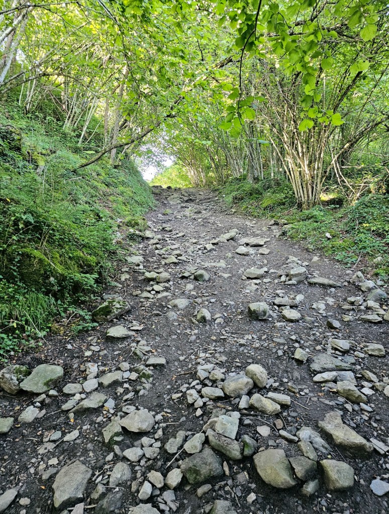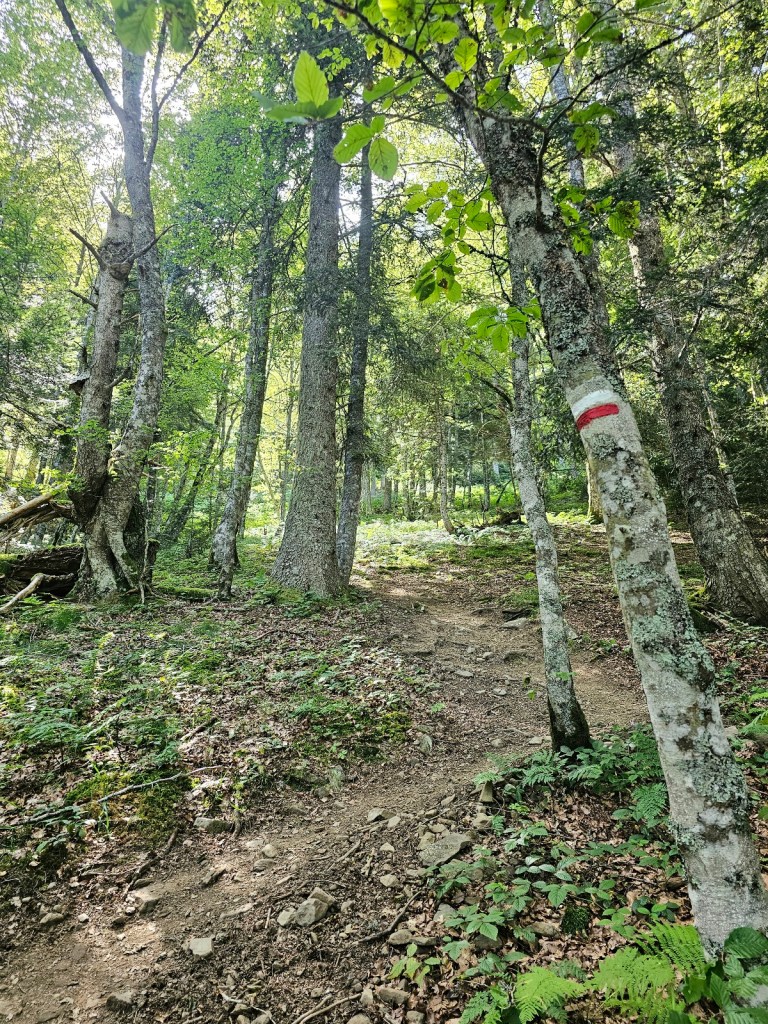Glücklicherweise biegt der Weg im oberen Teil in den Wald ab, was die Umgebung schöner macht, auch wenn es steil bleibt. Es ist aber wieder so gut zu merken, wie der Körper hier funktioniert. Mein Puls geht selbst in den steilen Stücken nie über 140, ich kann konstant mein Tempo für längere Zeit laufen und brauche kaum Pausen, höchstens zum Trinken. So stehe ich nach gut 3 Stunden oben am Pass und pflanze mich erstmal auf einen Stein, um eine kurze Rast einzulegen.
