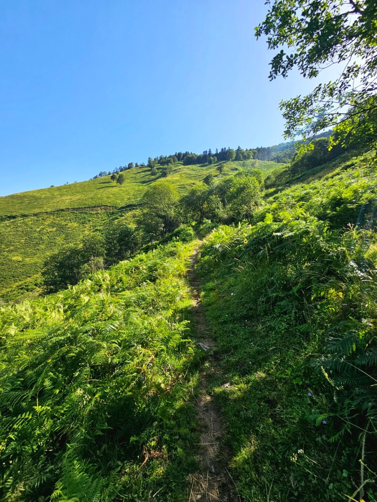 Ich schaue auf meine Uhr, der Abstieg ist erst zur Hälfte geschafft. Inzwischen geht es nicht mehr durch den Wald, sondern über schattenlose Wiesen steil bergab. Der Pfad ist schmal, der Farn an beiden Seiten drängt sich dicht an mich heran. Immer wieder laufe ich durch Hitzelöcher, wo die Luft steht und richtig kocht. Der Wasservorrat wird langsam eng. Man könnte durchaus auf die Frage kommen, warum macht man das eigentlich?