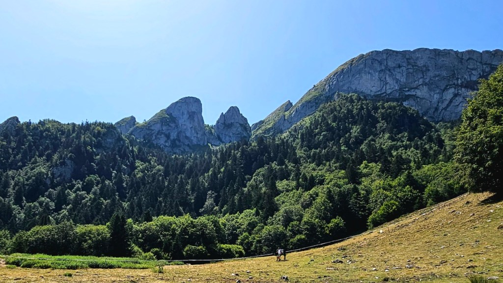 Auf ging es in den Wald, erstmal schön hoch und bereits kurz nach 9 Uhr war es gut warm. Die ersten 1,5 Stunden zogen so dahin, dann hieß es bereitmachen für den Anstieg des Tages – den Col de Barrancq auf 1600m Höhe galt es zu überwinden. Die Tourenplaner waren hier wieder sehr kreativ, man schickt die Wanderer halt eben einfach gerade die Kuhweide hoch. Um mich herum tausende Insekten, ich schlage ständig nach den Bremsen, erwische vielleicht drei, merke aber diverse Stiche an den Gliedmaßen. Es ist heiß, steil und dank des Kuhmist riecht es auch vorzüglich.