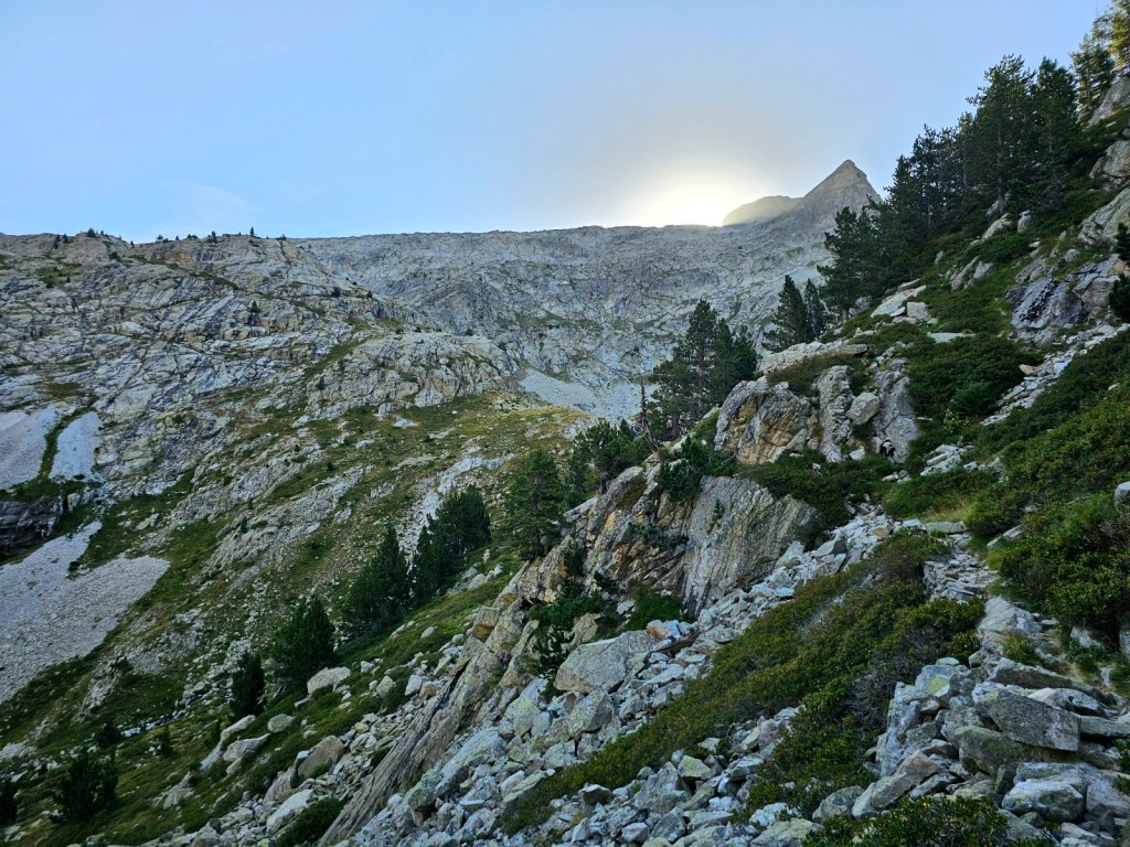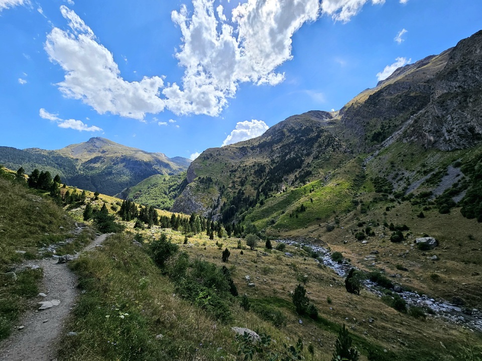 Das Ende ist recht schnell zusammengefasst. Ich nehme die Beine in die Hand, überquere diverse Bergrücken (was bedeutet, dass es immer wieder kurz hoch und runter geht, was auch ordentlich Kraft kostet) und erreiche schließlich eine Forststraße. Noch nie war ich so glücklich, auf einem breiten Weg zu laufen und nicht mehr jeden Schritt austarieren zu müssen. Inzwischen ist der Monte Perdido vor mir zu erkennen, einer der touristischen Highlights der Pyrenäen.