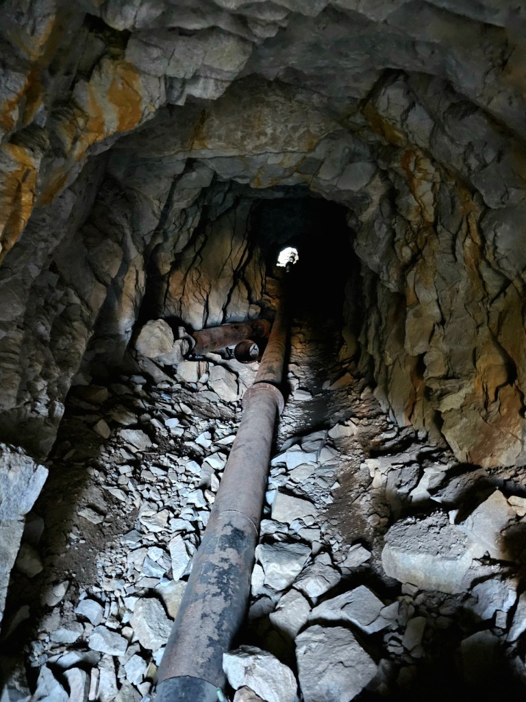 Der Weg zieht nun weiter am Hang entlang, spektakulär die Blicke in die Tiefe und die umliegenden Berge. Ein falscher Schritt kann hier schnell einen Sturz über mehrere hundert Meter bedeuten, so dass ich hochkonzentriert bleiben muss. So richtig lustig wird es aber erst, als das Wasserrohr ins Spiel kommt, was hier oben lang verläuft (ich vermute, dass der Weg ursprünglich für die Montage und Instandhaltung des Rohrs angelegt wurde). Es gibt Stellen, da muss man über das Rohr balancieren, während rechts der Hang gnadenlos steil abfällt. Zwei Tunnel sind zu durchqueren, einer so klein, dass ich mit Rucksack nicht durchkomme und diesen in gebückter Haltung durchtragen muss. Der zweite ist länger und währenddessen gilt es, unter dem Rohr durchzukriechen. Das Abenteuerlevel ist hier schon ganz hoch. Nach 1:40h erreiche ich das Ende des Pfads und wechsle nun auf den richtigen Wanderweg. Ich schnaufe durch, denn mental war das ganze sehr anstrengend, wohlwissend, dass jeder Fehler, jeder falsche Schritt bitter bestraft werden könnte.