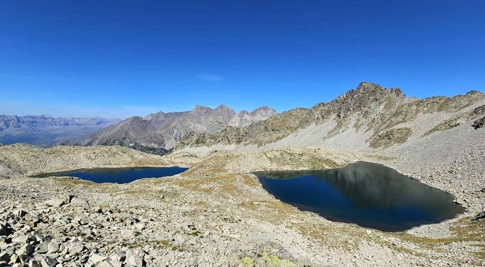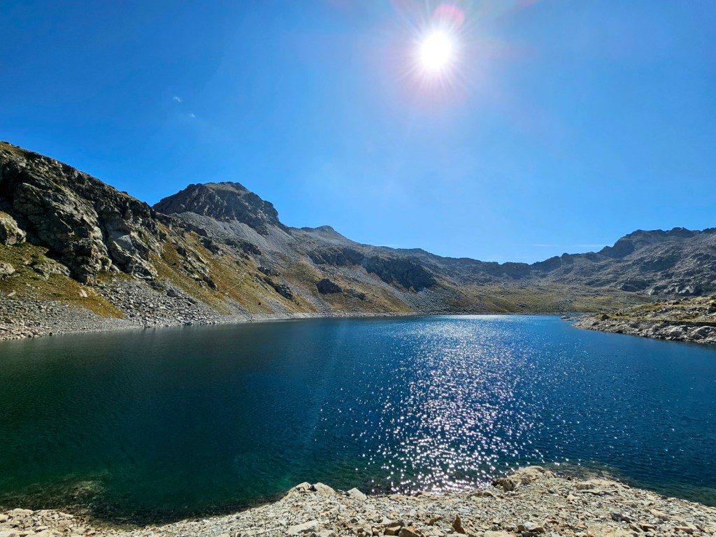 Das Schild hier verschafft nicht unbedingt beste Laune – es sind noch mindestens 6 Stunden angesetzt. Nun geht es hoch zu den Brazato-Seen, der Anstieg ist einigermaßen steil, aber gut zu laufen. Der erste See strahlt gnadenlos blau in der Berglandschaft, die Sonne glitzert auf der Oberfläche. Es ist fantastisch. Doch am höchsten Punkt bin ich noch lange nicht, eine erste Steilstufe wartet mit einer kleinen Kletterpassage auf mich. Die beiden nächsten Seen sind zu sehen und nun wird es richtig felsig. Laufen oder Wandern ist das nicht mehr, es gilt im Schuttfeld einen Weg zu suchen und teilweise mit den Händen am Hang entlang zu kraxeln. Bergauf geht das aber meistens noch und nach etwas mehr als drei Stunden stehe ich quasi Punkt 12 oben auf 2.560m Höhe und bestaune die umwerfende Landschaft.