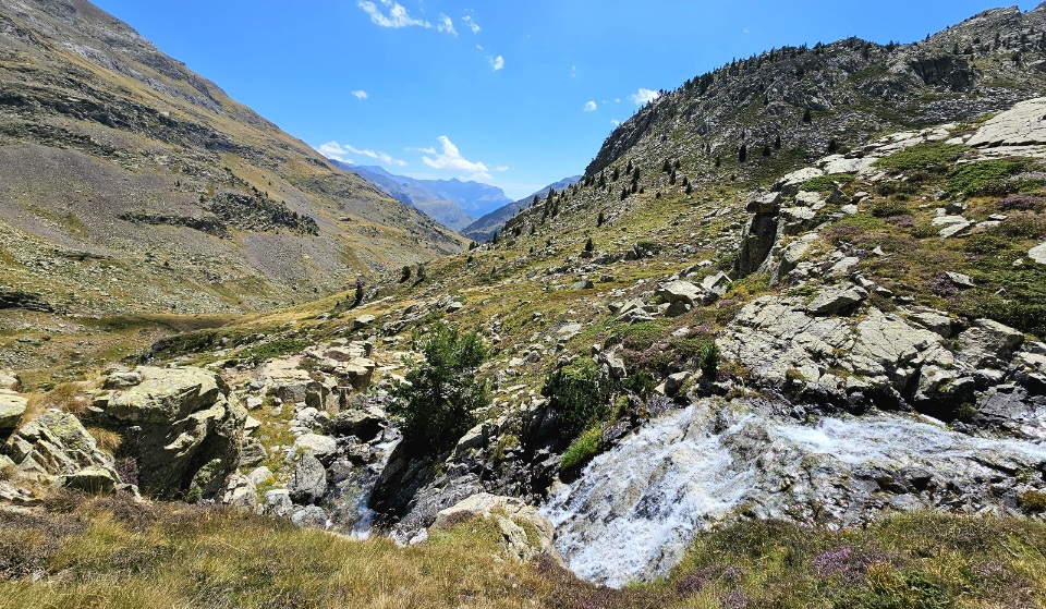 Vor mir schieben sich mehrere Dreitausender ins Blickfeld und weisen auch den Weg in den Abstieg. Das erste Stück ist steil, geht aber noch ganz gut zu laufen… und dann wurde es richtig übel. Riesige Schutthalden galt es nun zu überwinden, tausende Steine, Felsen, der Weg ging einfach mittendurch. Und das geht nur sehr langsam, da man jeden Schritt abwägen muss. Ist der Stein wackelig? Kann ich von dort weitergehen? Es dauert ewig, zerrt an allen Kräften und ist extrem demotivierend. Dazu verlieren sich die Wegmarkierungen mehrmals… so dass man teilweise wieder zurück muss, um nicht in eine Sackgasse zu laufen. Ich brauche ewig… Es ist ein wenig wie früher bei Takeshis Castle, als die japanischen Gameshow-Teilnehmer über das Wasser mit den Steinen hüpfen müssen und ich hoffe, dass unter mir keiner wegbricht, so dass ich „baden gehen“ muss. Nach etwa 5,5 Stunden erreiche ich mit der Querung des Flußes Rio Ava einen wichtigen Punkt, denn hier wechsele ich nun in offenes Gelände und hoffe, dass ich hier nun gut laufen kann.