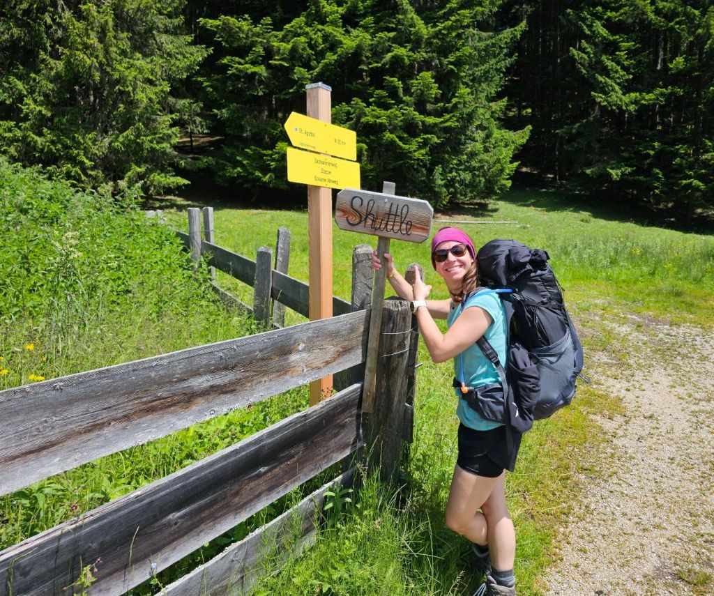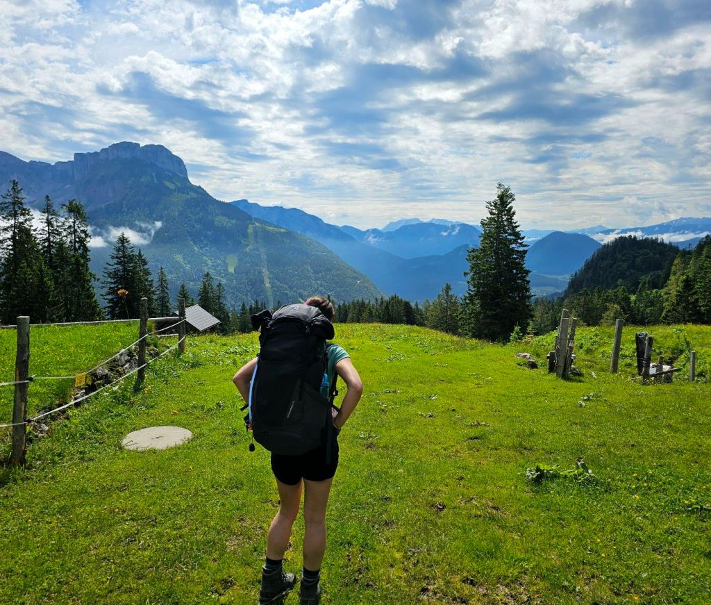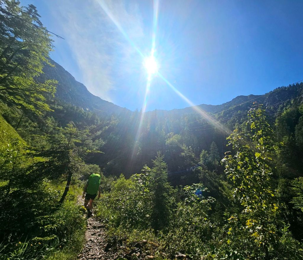 Nun gab es einige kleine Klettereinheiten, bis wir nach gut 2:15h die Lambacher Hütte erreichten, unser erstes kleines Zwischenziel. Diese war nicht bewirtschaftet, aber es gab Getränke mit Vertrauenskasse, die ich gern annahm und erstmal einen Liter Apfelschorle meine Kehle herunterspülte. Es war warm und durchaus anstrengend… hier trafen wir auch ein paar andere Wanderer, die uns in weiter Ferne zeigten, wo unsere Hütte steht, die wir irgendwie noch erreichen wollten.