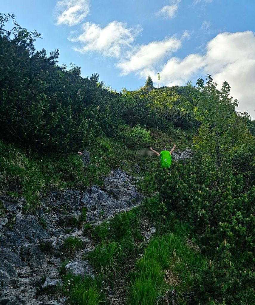 So ging es jetzt auf den Weg nach unten… über 1.000 Höhenmeter am Stück sind einfach grundsätzlich der Horror, vor allem als wir noch auf einen extrem steilen Weg runter sind, der zudem noch wahnsinnig rutschig war. Wild fluchend stocherte ich mit meinen Stöcken in der Botanik herum, um hier nicht wegzurutschen und den Hang herunter zu purzeln. Sandra hüpfte dagegen wie ein junges Reh gen Tal…