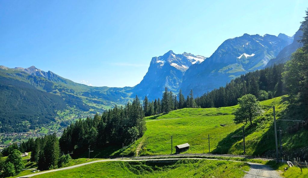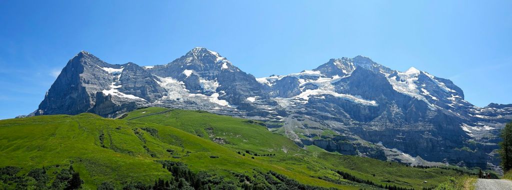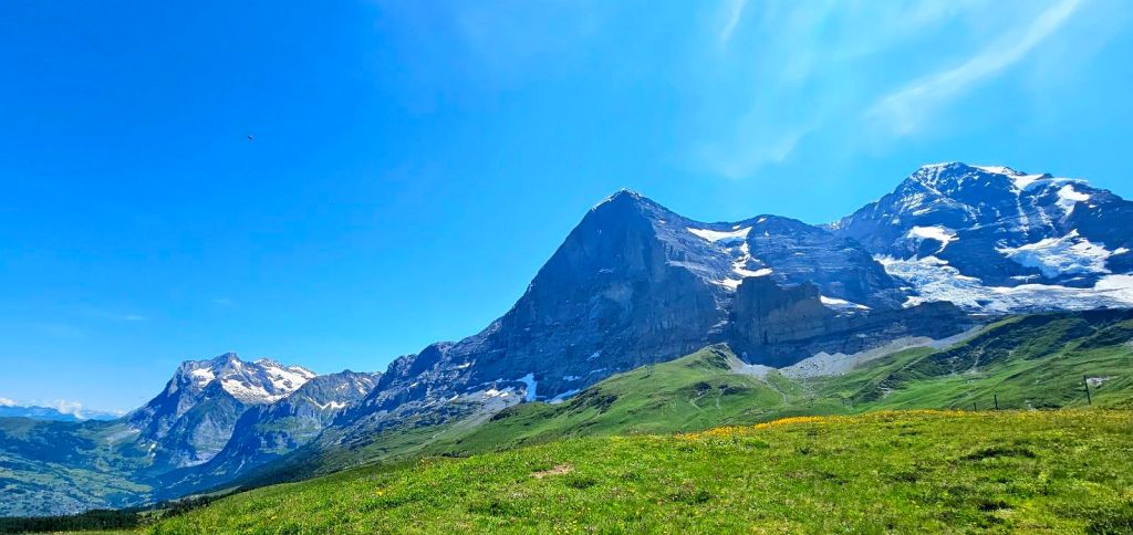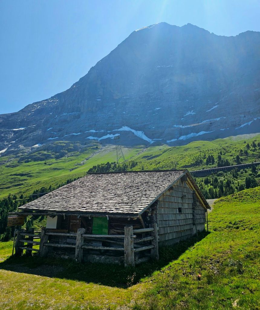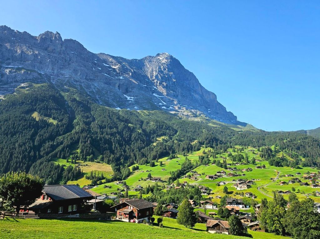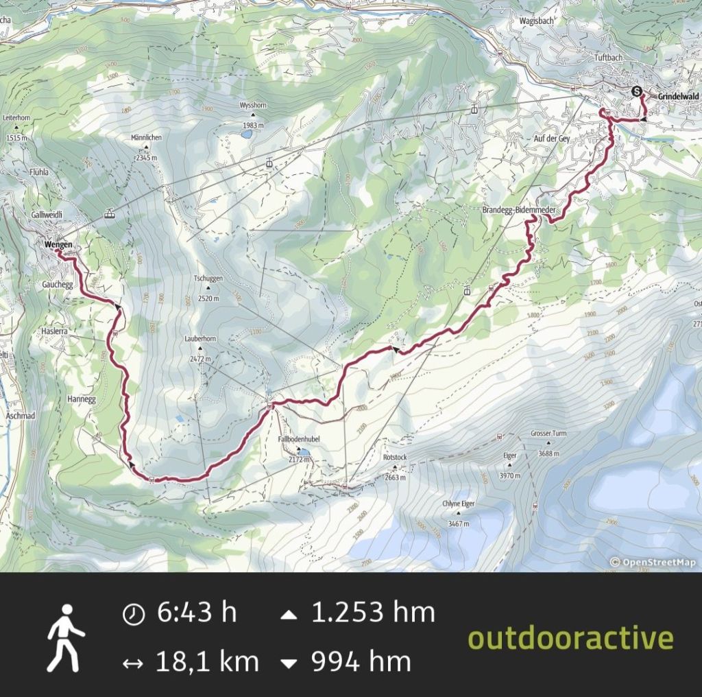 Am Tag zuvor war die riesige Nordwand des Eigers noch in Wolken gehüllt, am Morgen erstrahlt dieser Felsriese aber schon in seiner gesamten Pracht. Ich packe geschwind meine Sachen und starte gegen 9 in das heutige Abenteuer. Zuerst muss ich noch aus Grindelwald heraus, was bedeutet, dass ich erstmal ein wenig absteigen muss, um die Talsenke zu erreichen. Aber dann geht es hoch, der lange Anstieg zur Kleinen Scheidegg steht auf dem Programm.