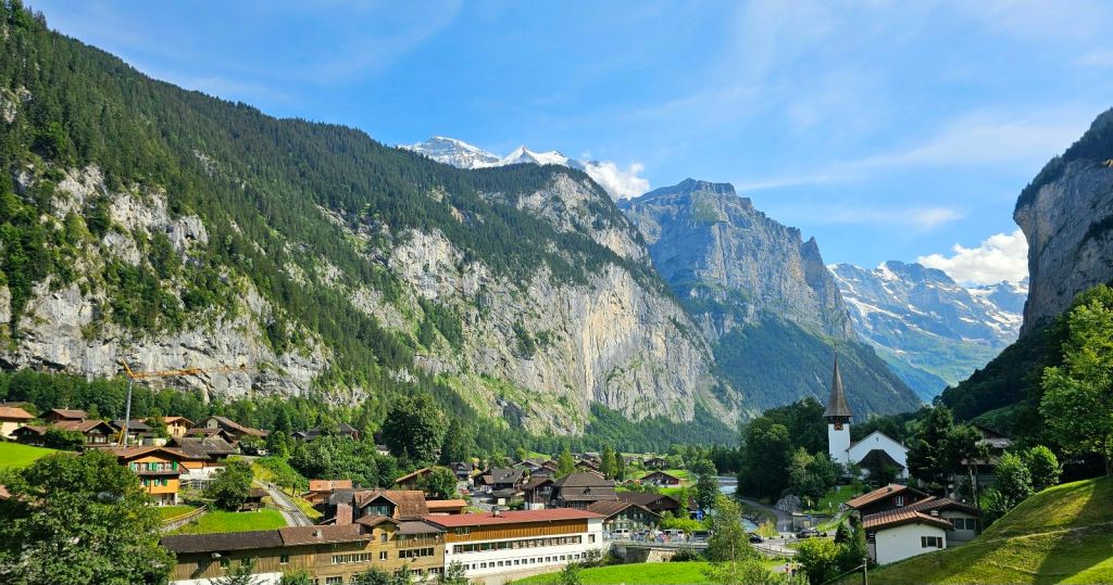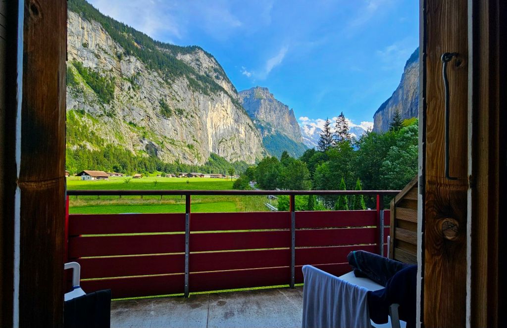 Lauterbrunnen ist nun der nächste Touri-Hotspot, links und rechts beschränken riesige, quasi senkrecht abfallende, Steilwände das enge Tal. Ich kämpfe mich durch die Menschenmassen, beobachte dabei, wie eine asiatische Touristin fast vom Auto überfahren wird, weil sie wegen einem Foto auf die Straße gerannt ist. Kopfschüttelnd geht’s in mein genial gelegenes Hostel. Hier tummeln sich unzählige Basejumper, die mit Wingsuits und Fallschirmen von den Felsen springen, völlig verrückte Typen. Am Abend genieße ich noch den wunderbaren Blick vom Balkon.