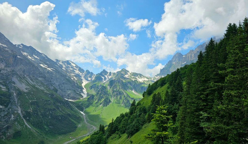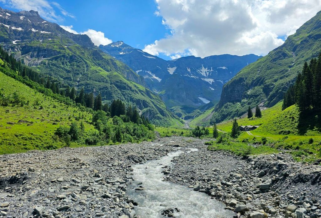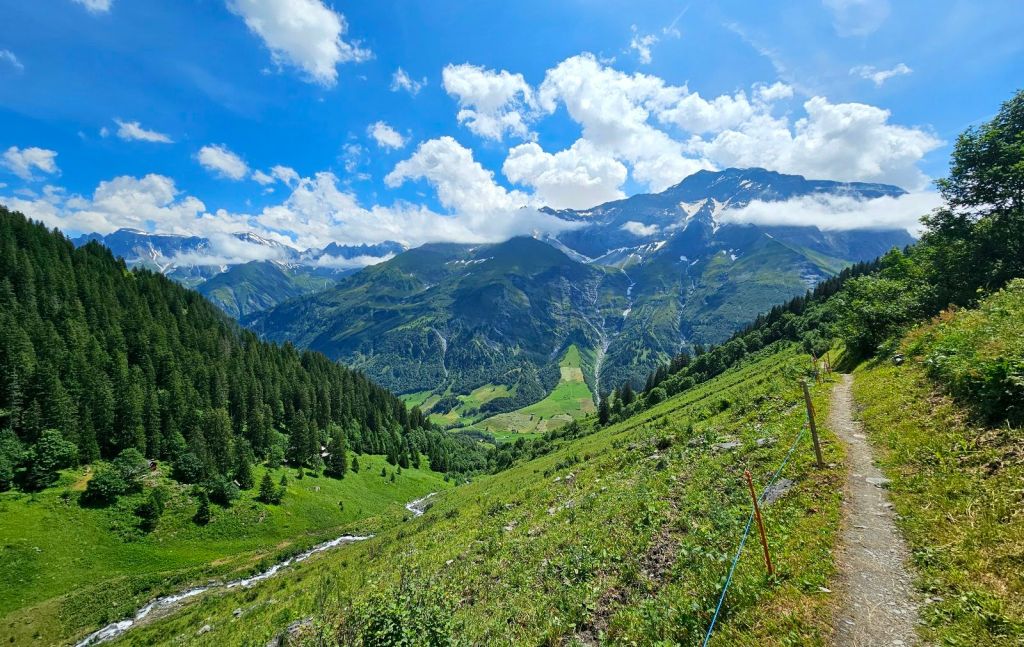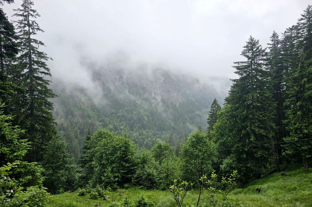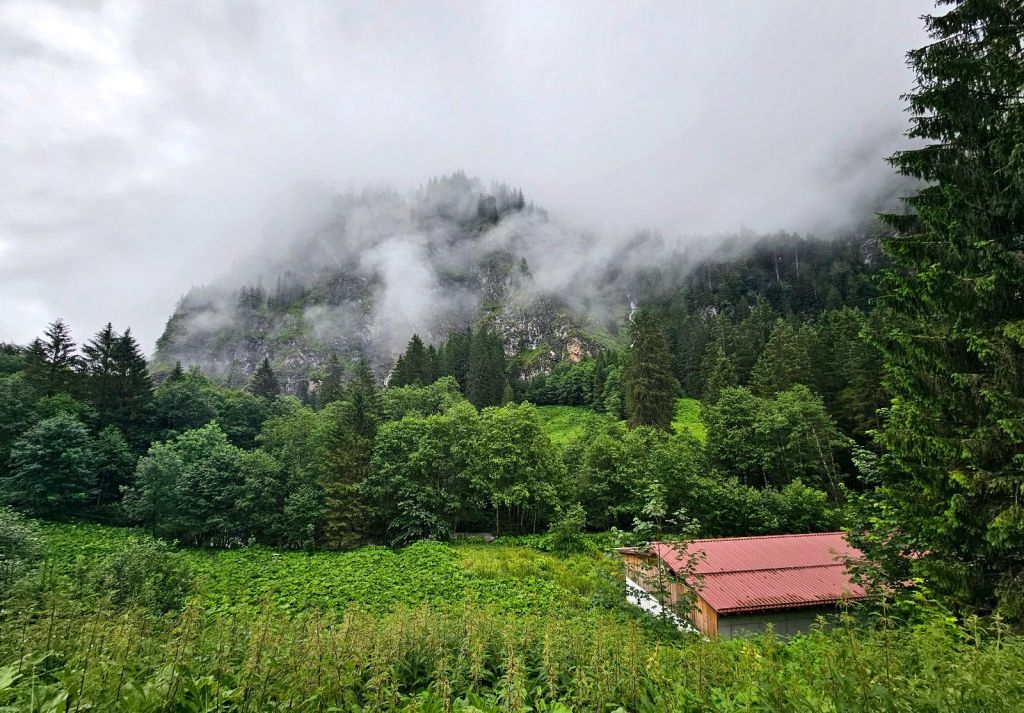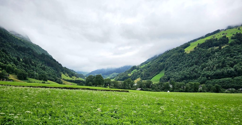 Die ersten Kilometer geht es noch durchs Weisstannental, ich entscheide mich hier für die spannendere Variante und laufe nicht die Straße entlang, sondern näher am Hang und mache dort schon die ersten Höhenmeter. Spannend wird es auch dadurch, dass ich mich kurzzeitig mal verlaufe, einem Kuhpfad folge und dann gezwungen bin, die Kuhwiese mit einer spektakulären Kletteraktion über den Elektrozaun zu verlassen. Die Natur hier ist grün, das Wasser kommt von überall herunter, so dass die Schuhe schnell nass sind.