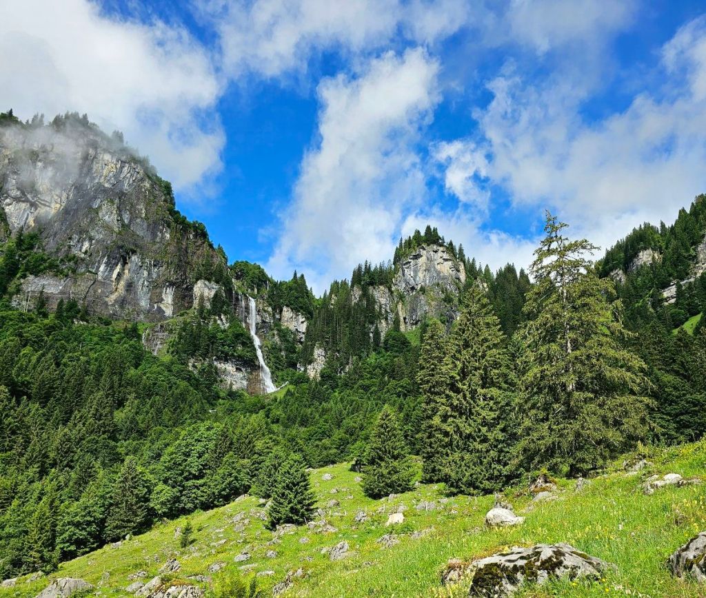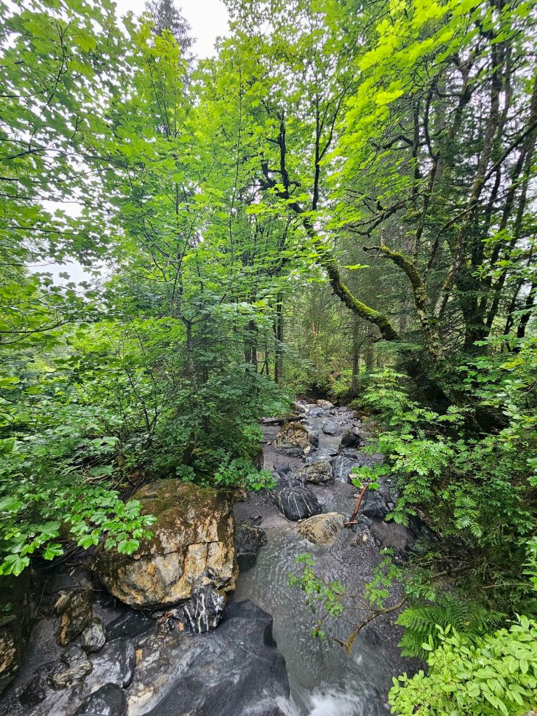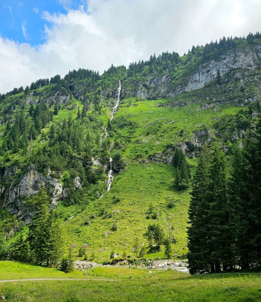 Steil ging es von Lauterbrunnen hinauf, im Gegensatz zum Vortag, der wandertechnisch eher langweilig war, gab es hier einen wunderschönen, aber richtig knackig steilen Waldweg, der an zahlreichen Wasserfällen und Bächen vorbeiführte. Von unten kann man nicht mal im Ansatz erahnen, wie schön der Weg durch die Steilwand führt.
