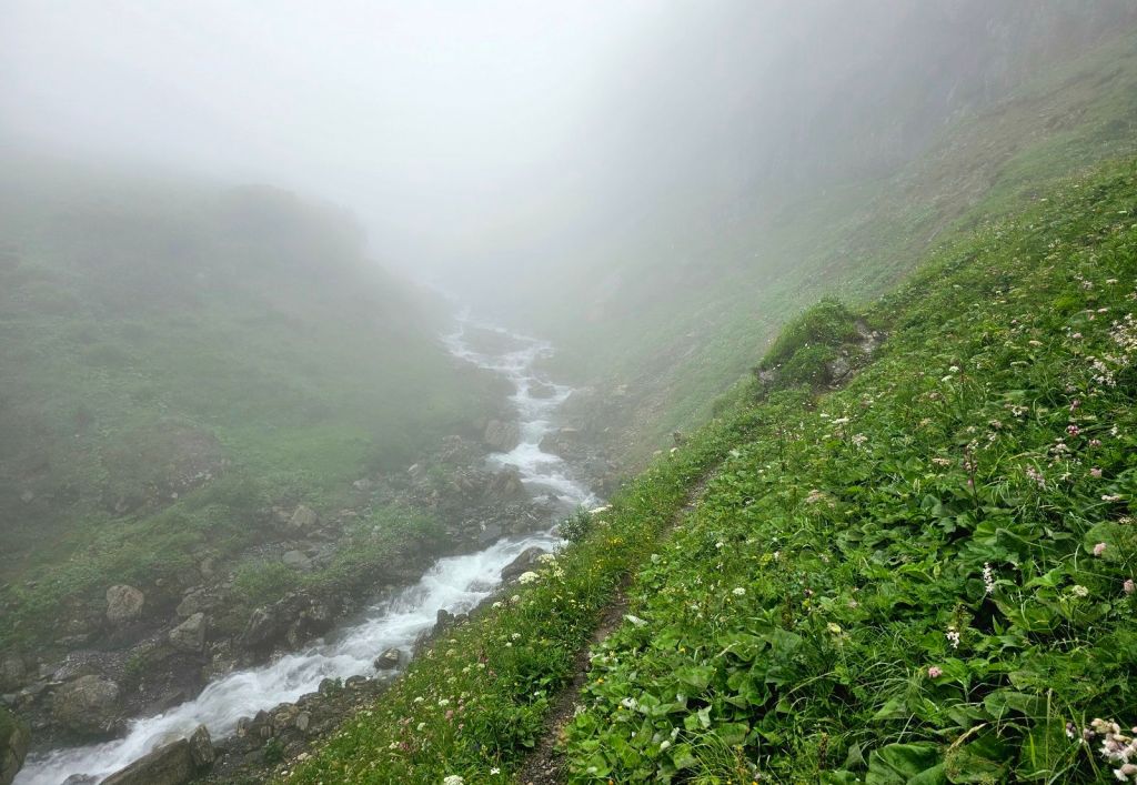 So ging es nun in den Hauptanstieg zum Pass hinauf und man sollte nicht enttäuscht werden. Die ersten 300 Höhenmeter zogen sich direkt steil den Hang hinauf über eine Art Geröll-Schutt-Weg, der mitunter nicht einfach zu laufen war. Inzwischen war ich dann auch im Nebel angekommen und die Stimmung war absolut gespenstisch. Kaum Sicht, um einen herum ein konstant lautes Rauschen von den ganzen Wasserfällen, der schmale Weg vor einem, der oberhalb vom rauschenden Bach führt, dessen reißende Wassermassen gen Tal stürzen.