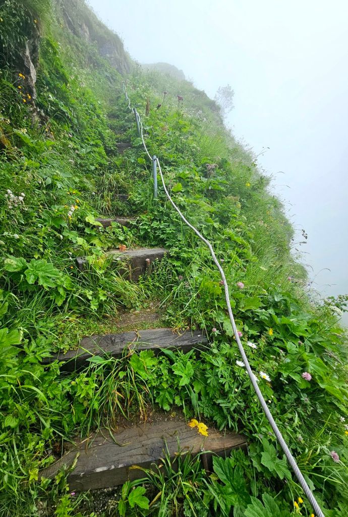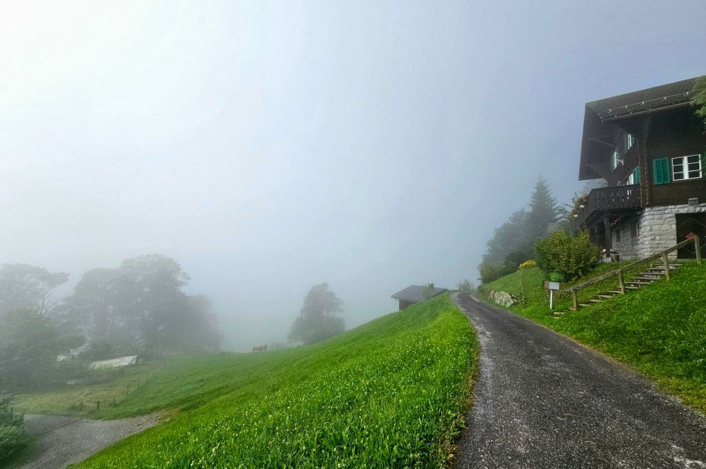 Oben verabschiede ich mich erstmal von den beiden, da ich sofort in den Abstieg wollte, um mich nicht zu verkühlen. Nach 1.300 Höhenmeter bergauf nun das gleiche wieder runter – ein Fest! Die ersten 45 Minuten ist es auch richtig steil, vorsichtiges Gehen am Berghang ist gefragt, während um mich herum geisterhafte Kuhglocken läuten – ich höre sie, aber eine Kuh bekomme ich dank des Nebels nie zu Gesicht. Das erste Ziel für den langen Anstieg ist die Besenbeiz-Alp, da ab hier der Weg angenehmer wird.