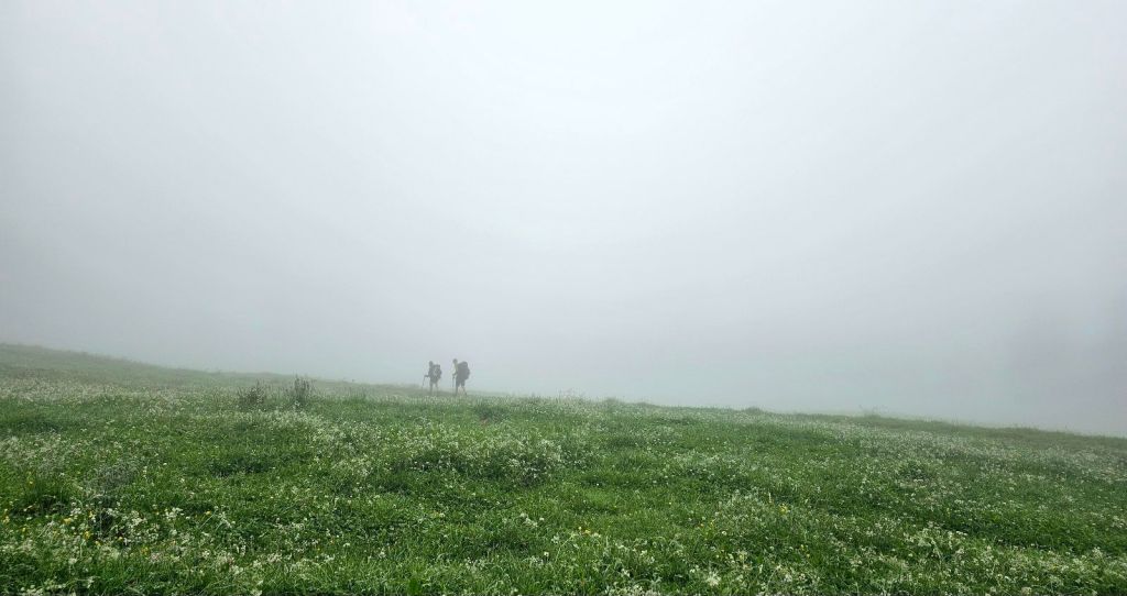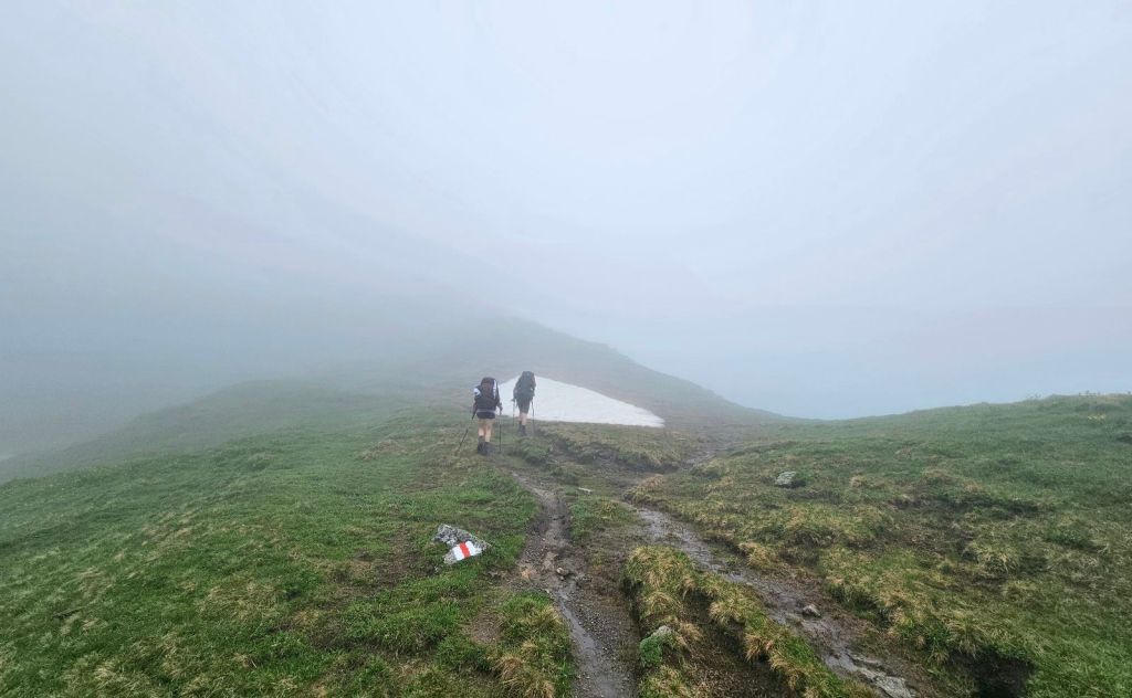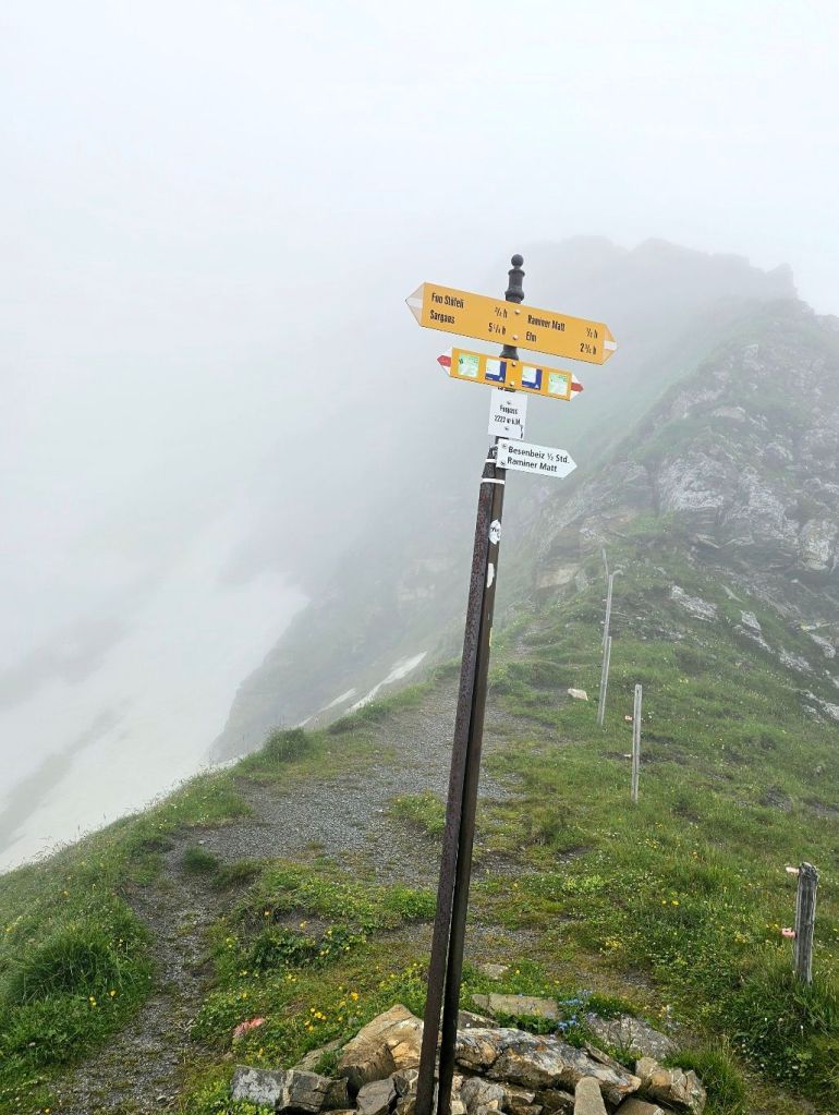 Sobald man nach dem Foo-Pass im Internet sucht, sieht man traumhafte Bilder, wie schön die Aussicht da oben ist (macht das gern mal und vergleicht es dann mit meinen Bildern). Richtung Westen schaut man auf die kommenden Gipfel der Via Alpina, ein absoluter Panorama-Spot. Nun – heute leider nicht. Also so gar nicht. Nicht mal so, dass man bis zum nächsten Berg sehen kann, nein – nach 20 Metern wird jeder Blick vom Nebel verschluckt und die Augen nehmen nur das immerwährende Grau wahr, welches mich den ganzen Tag begleitet.
