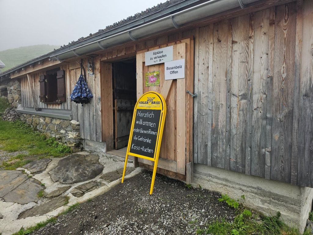 Während ich mich der Hütte nähere, sehe ich bekannte Gesichter – die deutschen Frauen von der Alp Siez sitzen drinnen und gönnen sich Kaffee und Kuchen. Spontan geselle ich mich dazu und gönne mir auch ein Käffchen. Annelies und Fritz sind absolut goldige Gastgeber, die jeden in ihre private Stube winken, der hier vorbeikommt. Wir unterhalten uns noch ein Weilchen, dann muss ich aber weiter – der Abstieg ist noch lang. Trotz des bescheidenen Wetters, die Herzlichkeit an diesem Ort wird mich noch lange begleiten.