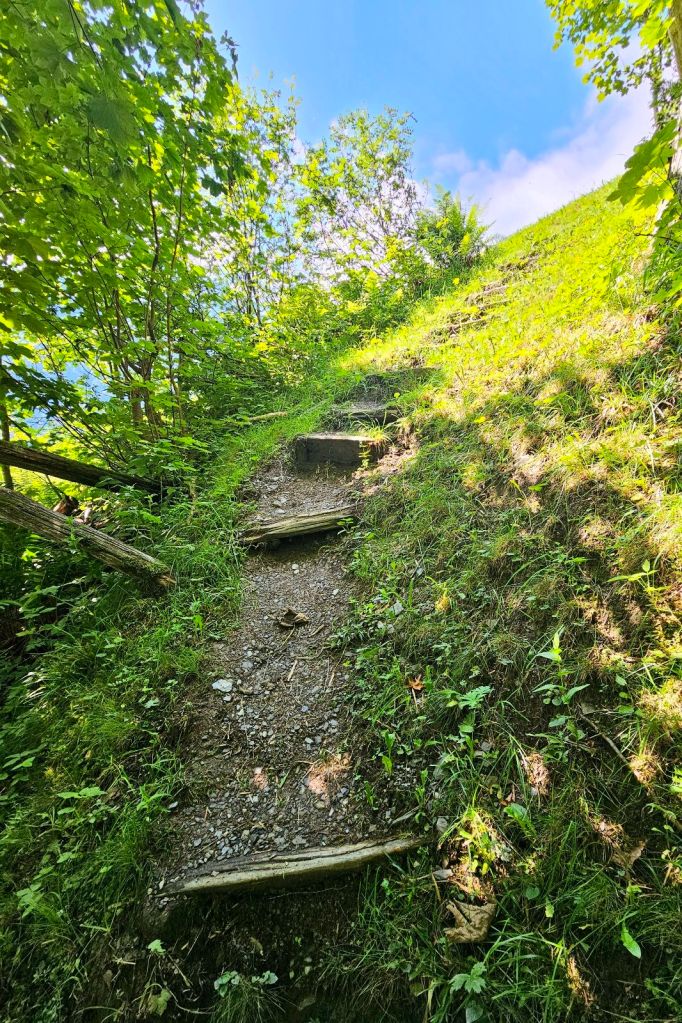 So geht es nun erstmal in den Anstieg, steil den Berghang hinauf. Am Anfang führt der Weg über einen schönen Waldpfad hinauf, wechselt aber recht schnell auf unangenehme Beläge. Breite Schotterwege, stellenweise Asphaltstraßen, die Wegführung ist nicht toll. Und je weiter hoch es geht, desto steiler wird es. Am Ende noch über Treppen, während rumherum immer wieder Bremsen Attacken auf mich fliegen.