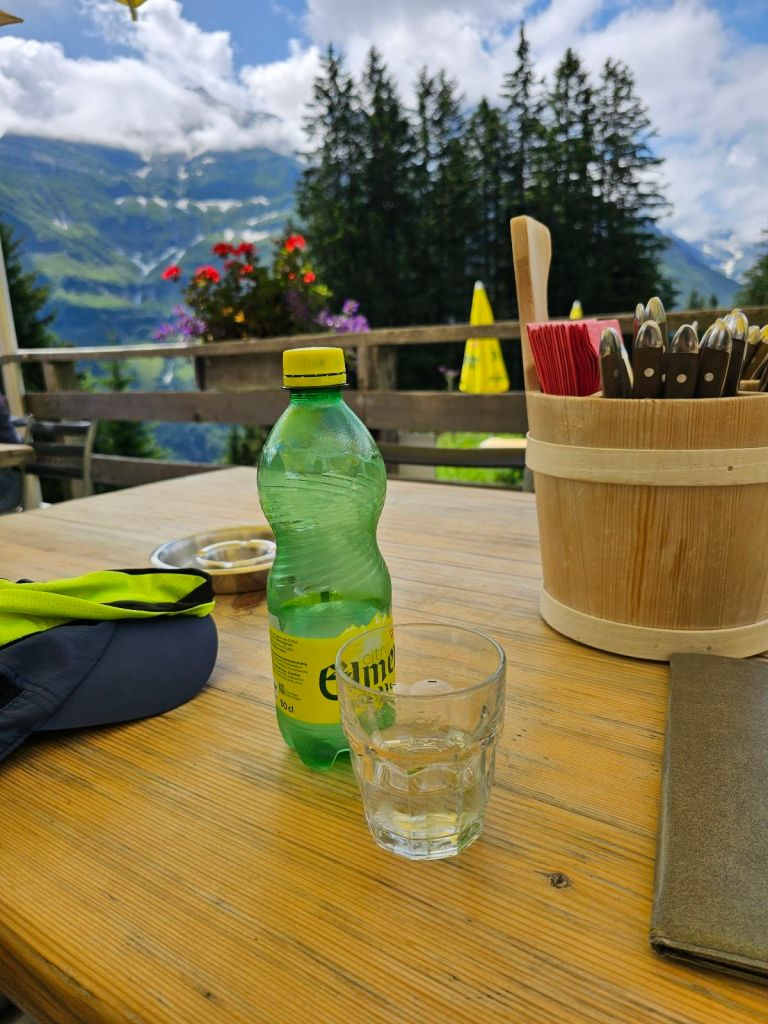 Nach gut 1:45h war es dann geschafft und ich erreichte das Tal. Hier fand ich dann direkt bei einem kleinen Hofbetrieb ein Schild, dass auf kühle Getränke hinwies und schwups gönnte ich mir eine Pause im Schatten mit einer kühlen Cola in der Hand. Das ist hier echt besonders – man findet immer wieder die Almen und Höfe, die Käse, etc. verkaufen, aber eben auch Getränke und das war perfekt platziert am Ende dieses steilen Hangs.