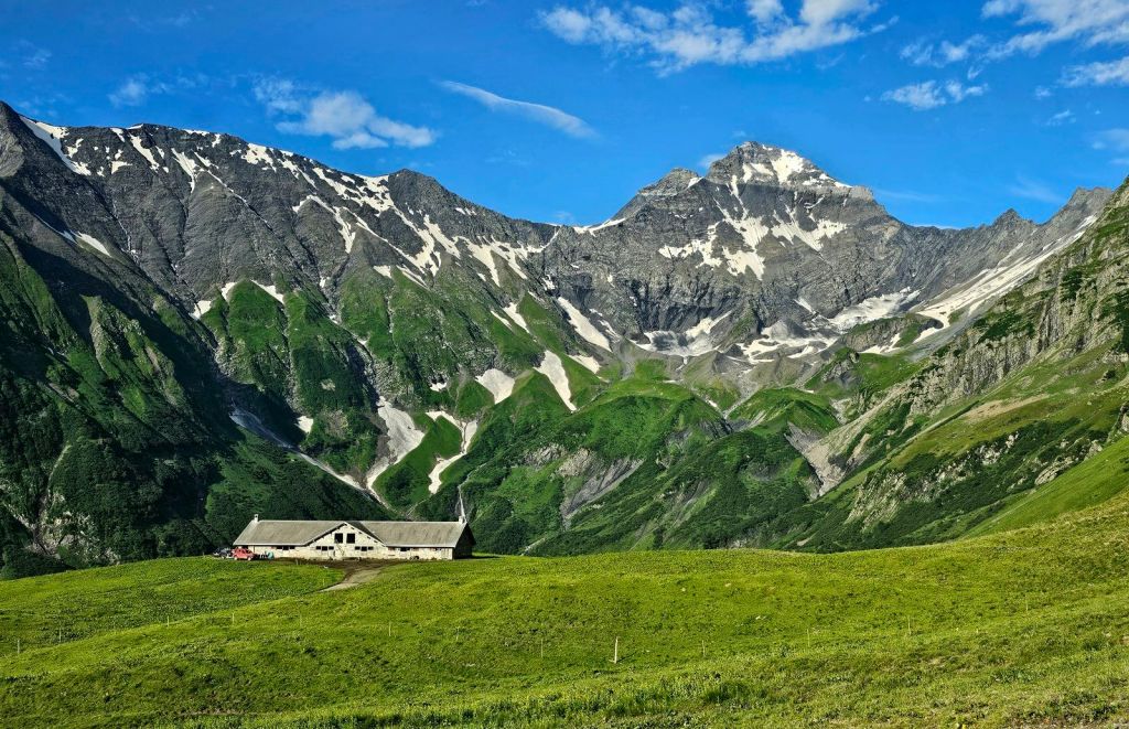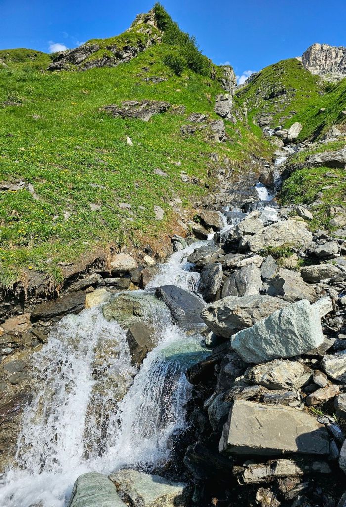 Melli kommt hochgelaufen, als ich an ihrer Hütte bin, da die Kühe aktuell noch nicht oben sind. Der Schnee hielt sich hier oben sehr lang, so dass noch nicht genug Gras vorhanden ist. Aber in ein paar Tagen sollen sie dann hochkommen. Ich bekomme dann auch direkt mal einen Eindruck von den Gegebenheiten und mit „Heidi-Urlaub“ hat das ganze hier wenig zu tun. Arbeiten von 5 bis abends um 8, die Hütte hat alles Lebensmotwendige, Luxus gibt es aber gar nicht, geduscht wird im Wasserfall. Immerhin gibt es davon zwei zur Auswahl, da kann man sogar immer mal wechseln. Nach gut einer Stunde muss ich dann aufbrechen und gestärkt mit einem Kaffee geht es für mich nun weiter. Welch ein schönes Gefühl, ein bekanntes Gesicht hier oben zu treffen!