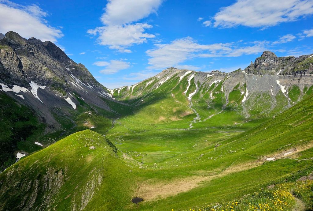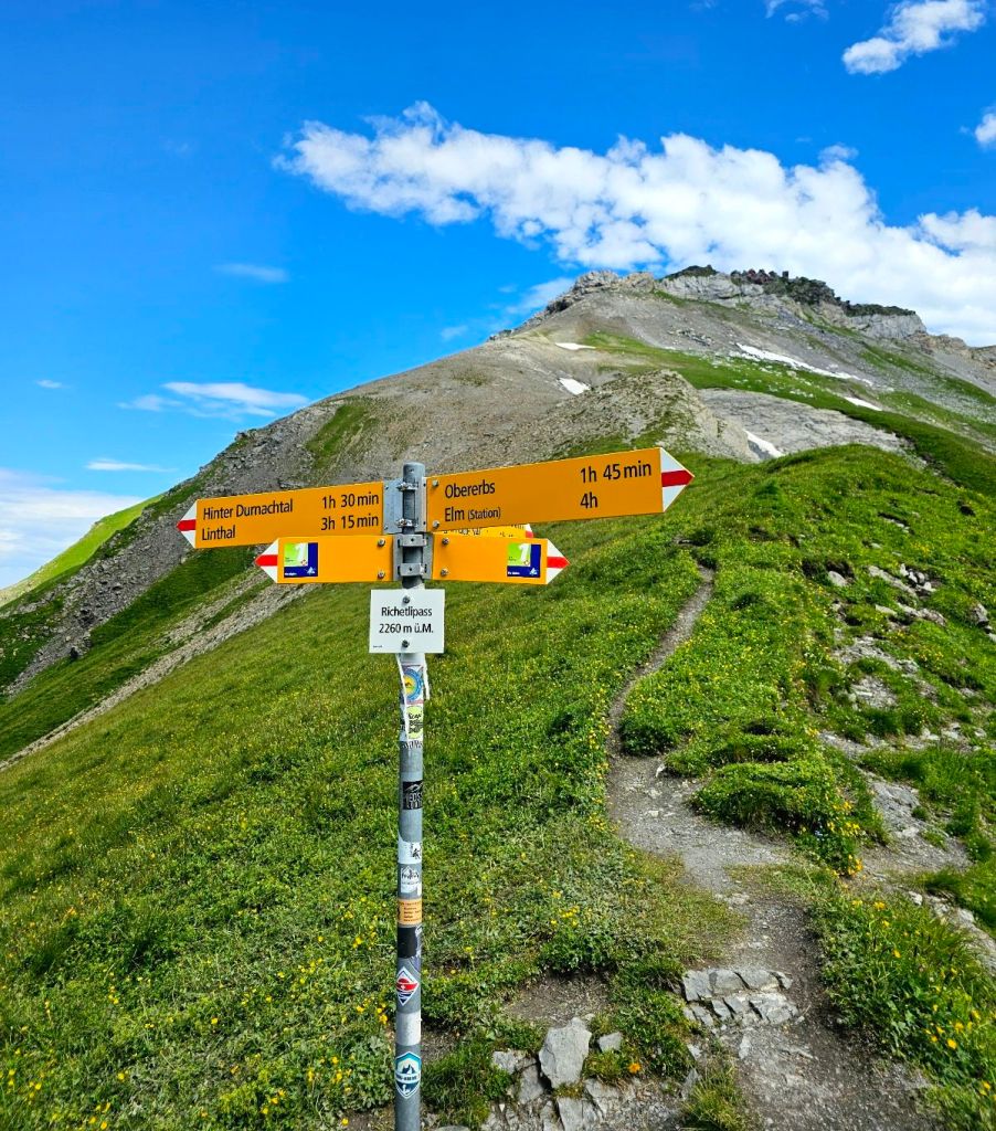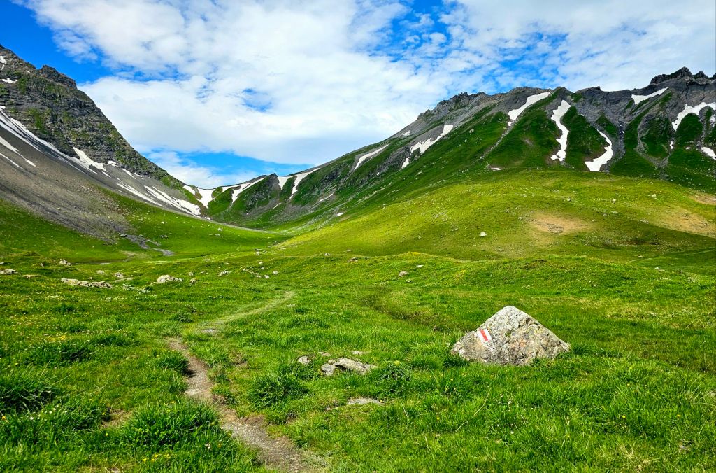 Auf zum Richetlipass heißt es nun, zuerst über die saftigen grünen Wiesen und dann hoch zum Übergang ins nächste Tal. Aus der Ferne sieht das alles noch sehr weiß aus, aber glücklicherweise kann man die Schneefelder fast komplett umgehen, was nix anderes bedeutet, dass man auf allen Vieren einen Grashang hochkraxelt. Aber immer noch besser als das Schneefeld. So stehe ich dann 11:40 Uhr auf dem Pass und erfreue mich am dargebotenen, wahnsinnig schönen Panomara.