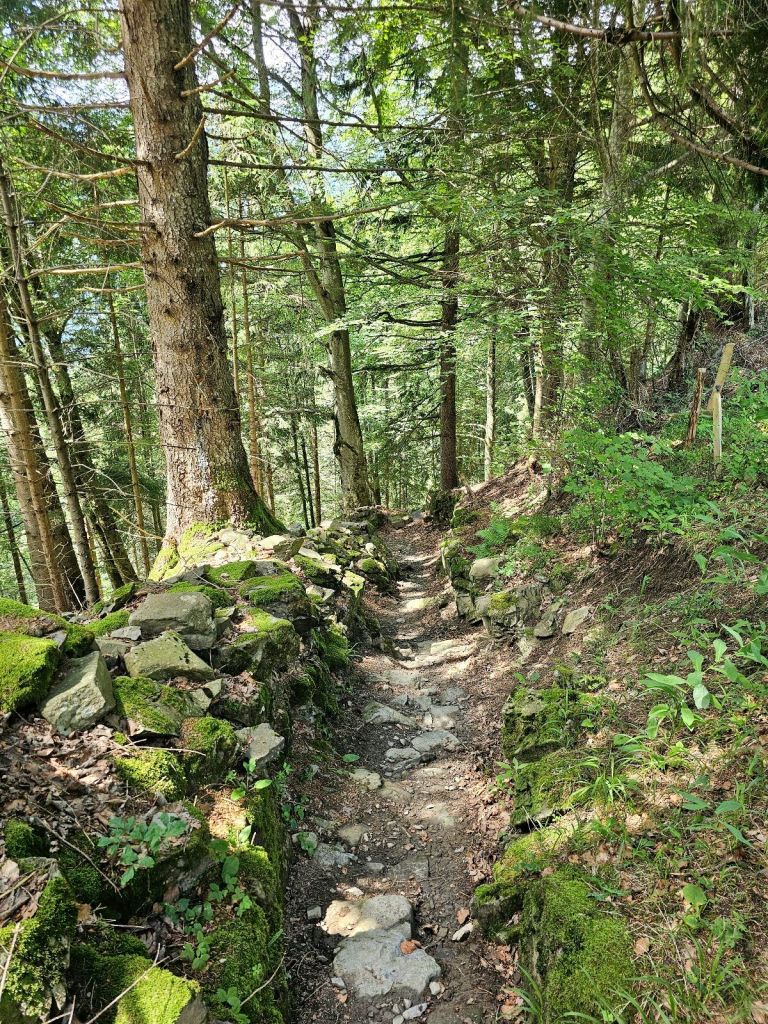 Aber heute muss es sein. So geht es in den ersten Anstieg. Also eigentlich ist es ein großer und langer mit über 1.200 Höhenmetern am Stück, aber durch zwei kurze ebene Abschnitte ergibt sich quasi eine Dreiteilung. Im Wald stampfe ich die ersten Höhenmeter bergauf, ganz allein, irgendwie will hier niemand hoch. Über steile Treppen erreiche ich schließlich das erste Almgelände, gut 300 Höhenmeter sind geschafft. Inzwischen hat mein Körper wieder umgeschaltet – gefühlt habe ich die Schmerzen im Knie herausgelaufen und der innere Schweinehund ist in seine Hütte zurückgekehrt. Nun übernimmt wieder der Wanderflow, das pure Vergnügen an der körperlichen Qual.