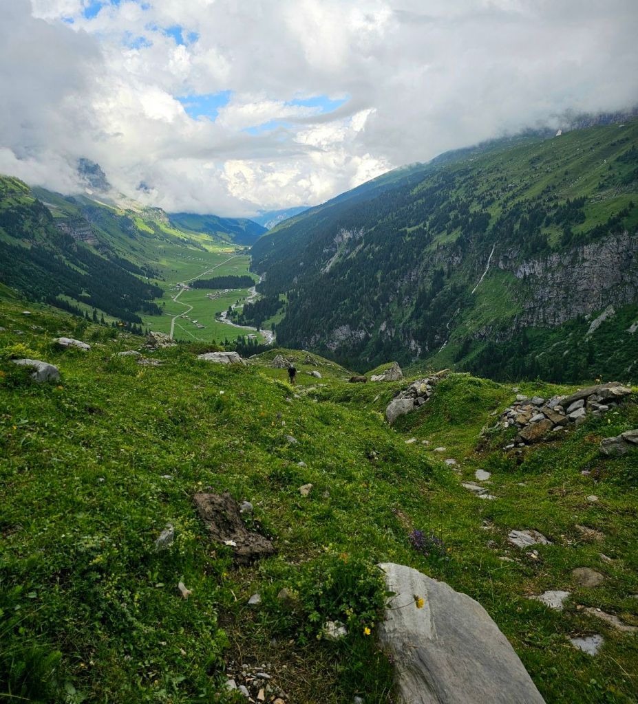 Gut 500 Höhenmeter sind hierfür nun veranschlagt. Ich nehme die Beine in die Hand und begebe mich in die endlosen Serpentinen, die der Hang für mich bereithält. Es lässt sich aber gut laufen, keine Ahnung wie die Schweizer das geschafft haben, aber ich komme gut vorwärts. Bei einer kleinen Pause treffe ich einen Schweizer, der die Via Alpina andersrum läuft und mir von großen Schneemengen hinter Lauterbrunnen erzählt. Davon hab ich auch schon gehört und werde da leider auch einiges umplanen müssen.