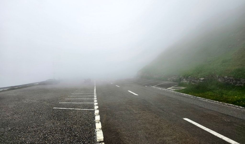 Im Normalfall hat man von hier oben auch eine wunderschöne Aussicht – nur nicht eben am Abend und am heutigen Morgen. Der Nebel hüllt den Pass komplett ein.