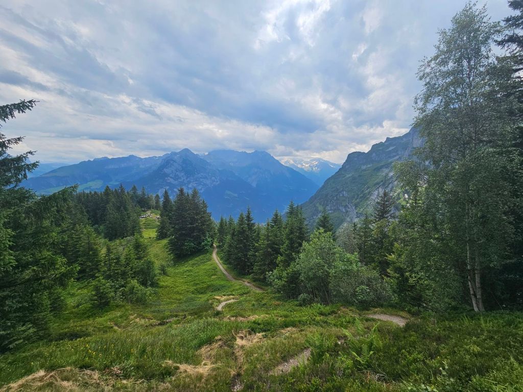 Falls man nun dachte, damit wäre es geschafft – falsch gedacht. Denn hier war ich immer noch auf einer Höhe von über 1.350 Metern, während Linthal – der nächste Ort – auf 700 Metern liegt. Was bedeutet, dass nun nochmal einiges abgestiegen werden musste. In Summe waren es heute fast 1.800 Höhenmeter im Abstieg und die durchgehend warmen Temperaturen forderten langsam ihren Tribut, der Tank war langsam leer. Zum Schluss ging es nochmal steil durch den Wald bergab, inzwischen galt nur noch runterkommen als Ziel.
