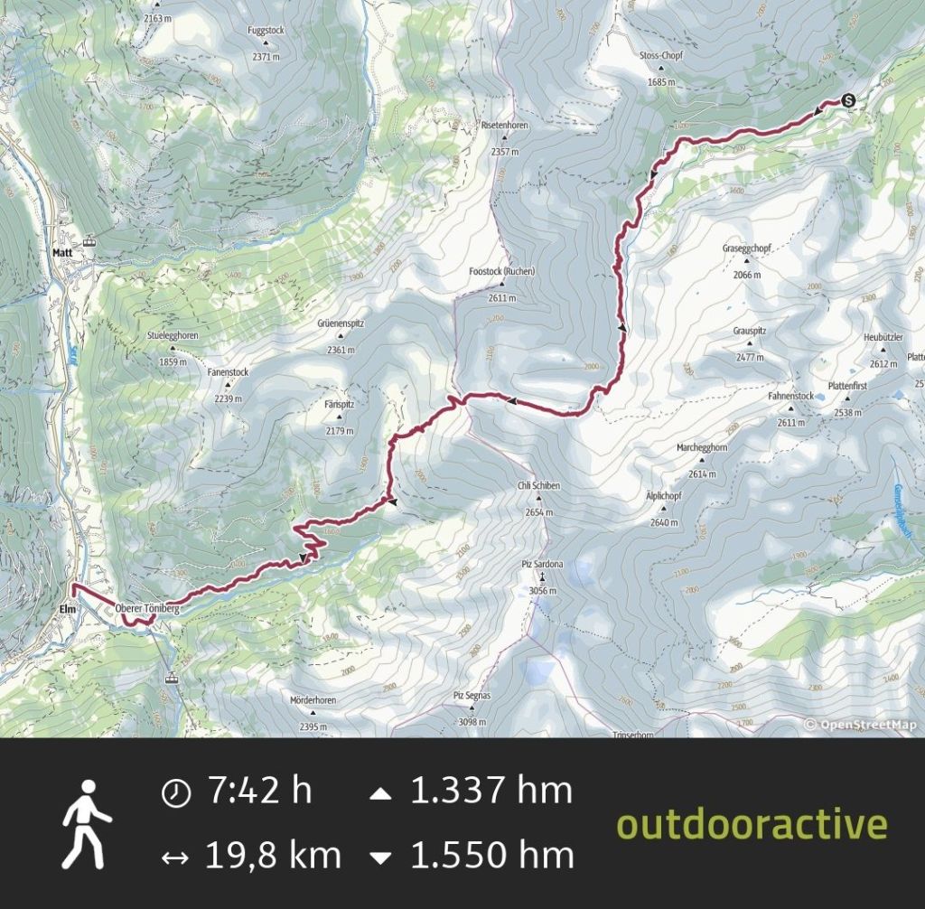Heute geht es auf die erste „große“ Etappe der Via Alpina. Groß in dem Sinne, dass ordentlich Höhenmeter anstehen, um ins nächste Tal zu gelangen, außerdem geht es das erste Mal über einen Pass mit über 2000 Metern Höhe – dem Foo-Pass (2223m).