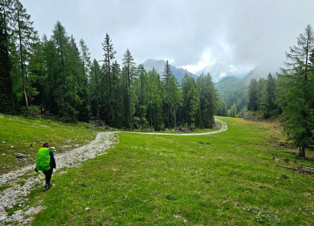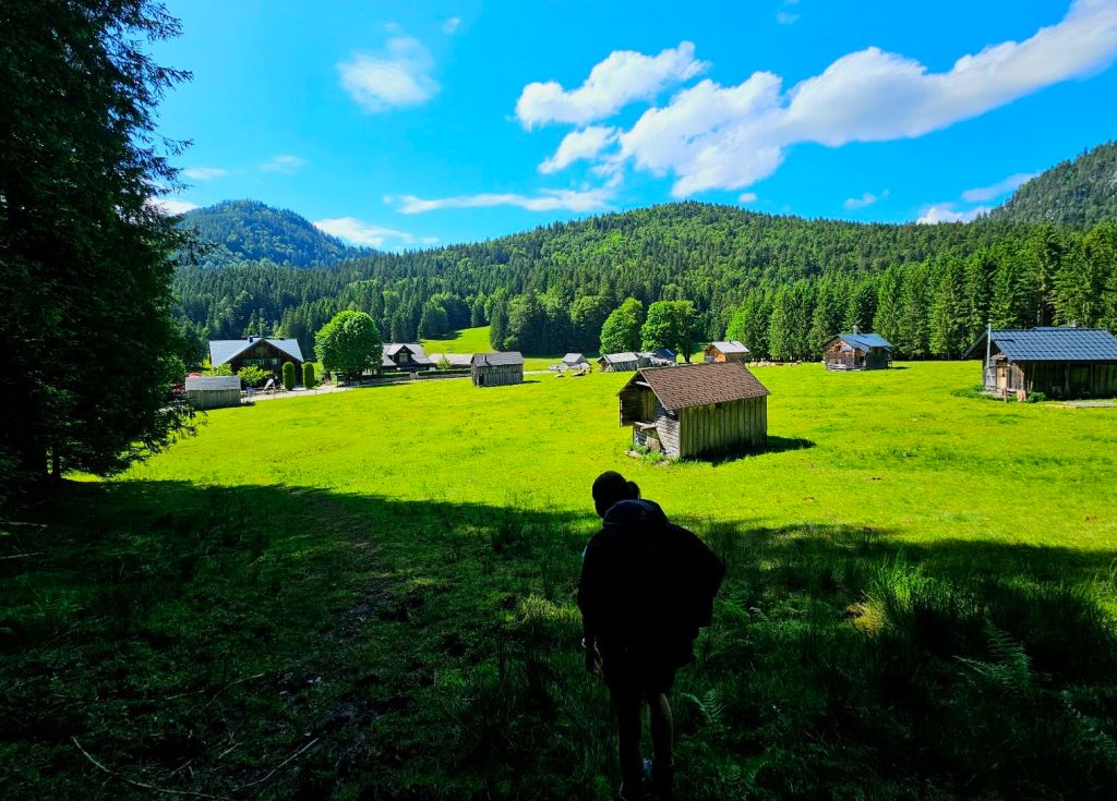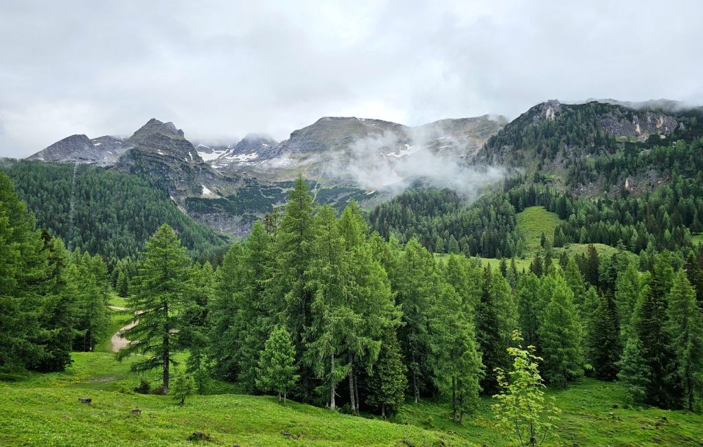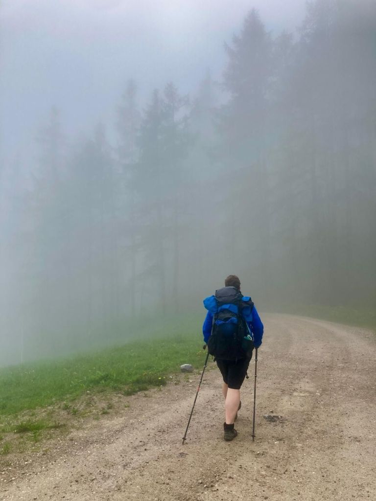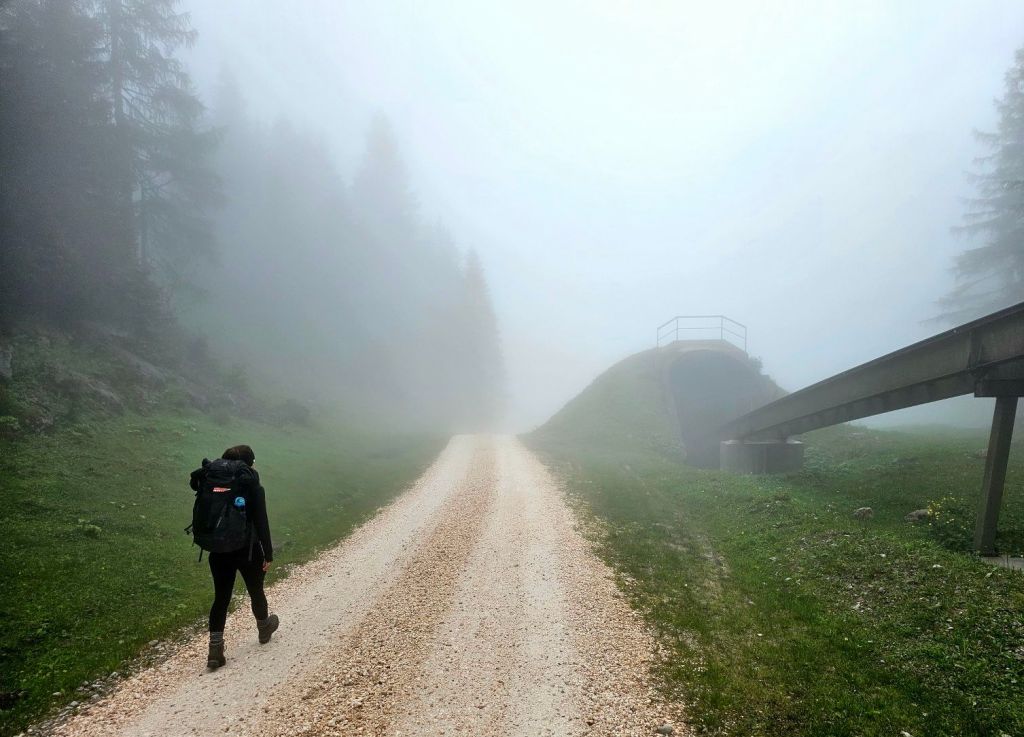 Über Asphalt ging es hinunter ins Tal, wo ich zwei junge Frauen traf, die dann das gleiche Tagesziel wie ich anvisierten. Die beiden sind seit Mitte April unterwegs, gestartet in Triest und durchqueren gerade den kompletten Alpenbogen. Völlig irre (und ein Stück beneidenswert, soviel Zeit für so ein Projekt zu haben – kleiner Wink in Richtung Murnau 🙂 ).