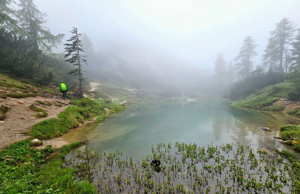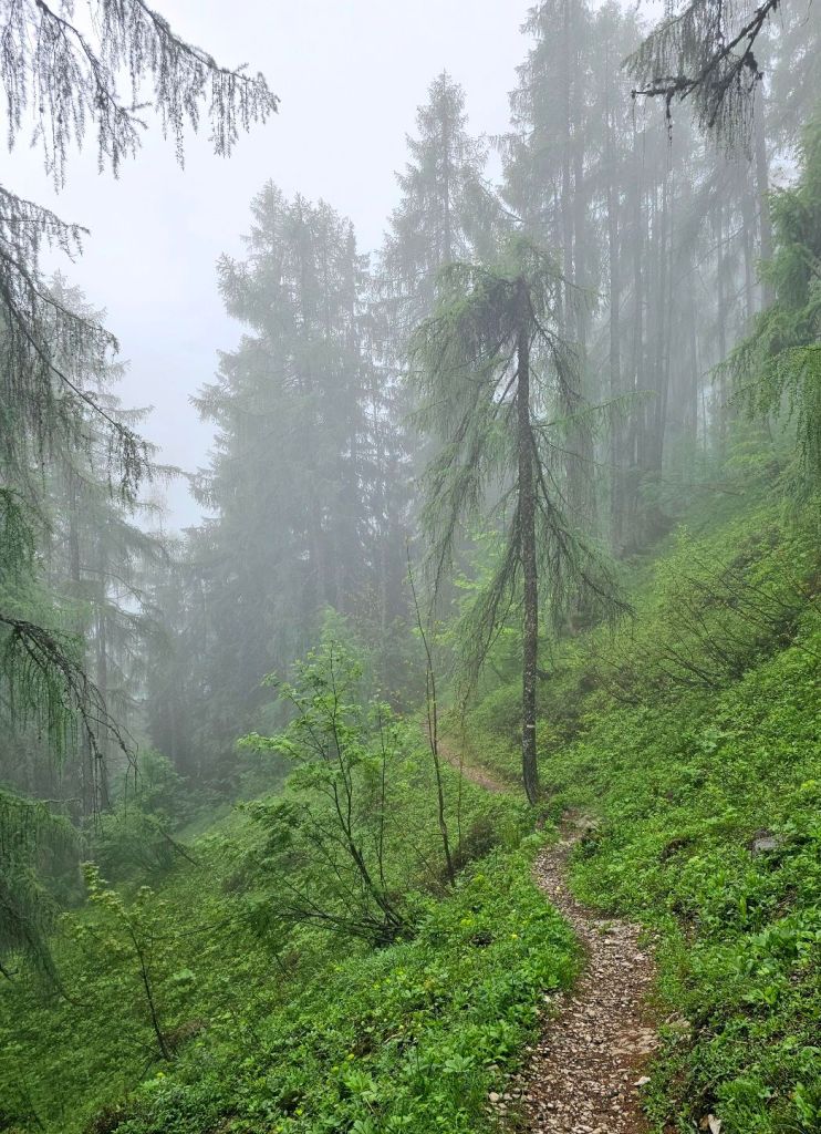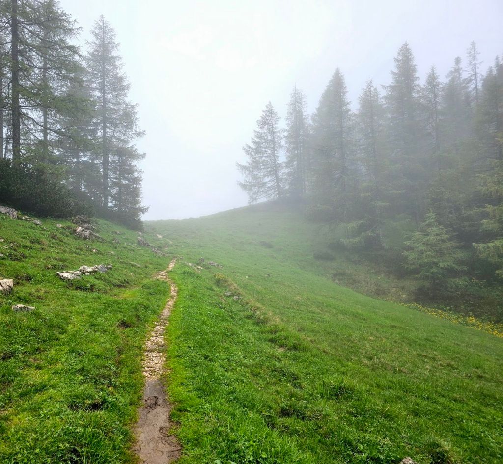 Der Weg war insgesamt sehr gut zu gehen, stellenweise noch etwas nass und rutschig, aber doch in sehr gutem Zustand. Sehr fix kam ich dann auch am höchsten Punkt an und hatte hier schon ordentlich Zeit im Vergleich zu den Wegweisern gut gemacht. Nun führte der Pfad am Hang entlang und ich durfte in die Nebelsuppe eintauchen, die eine beeindruckende Atmosphäre schuf.