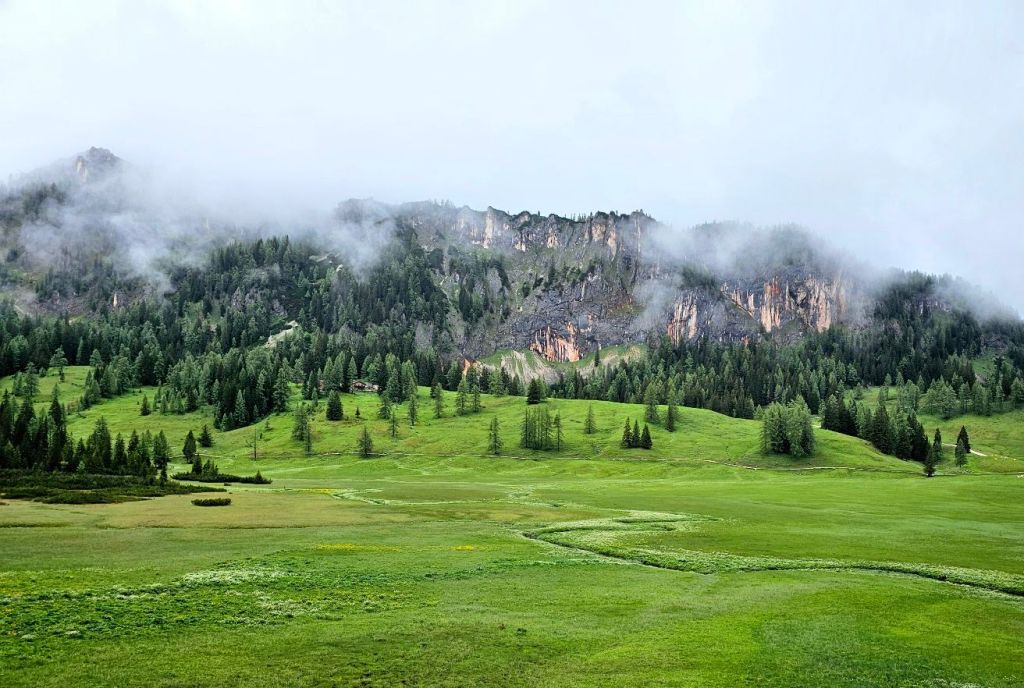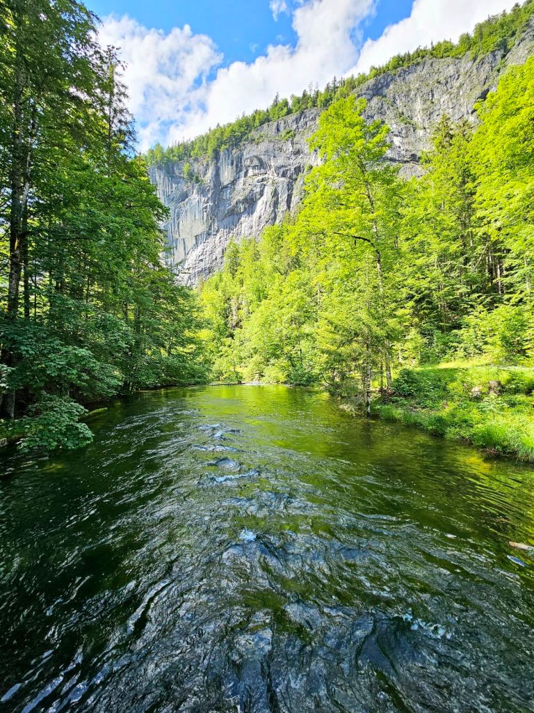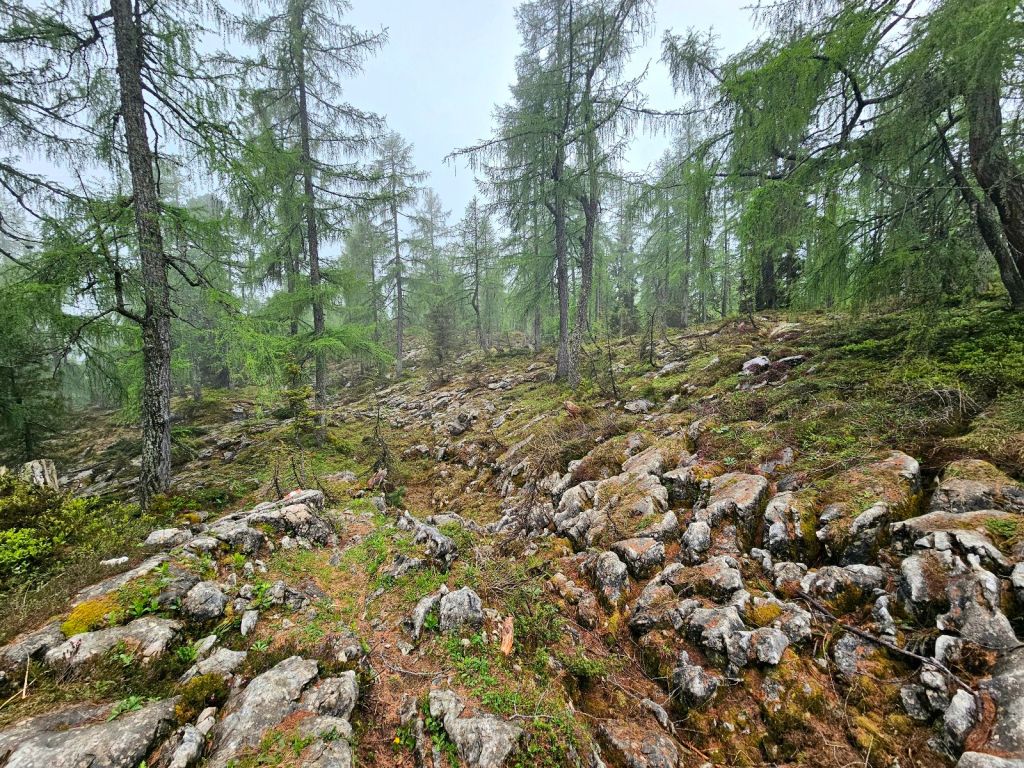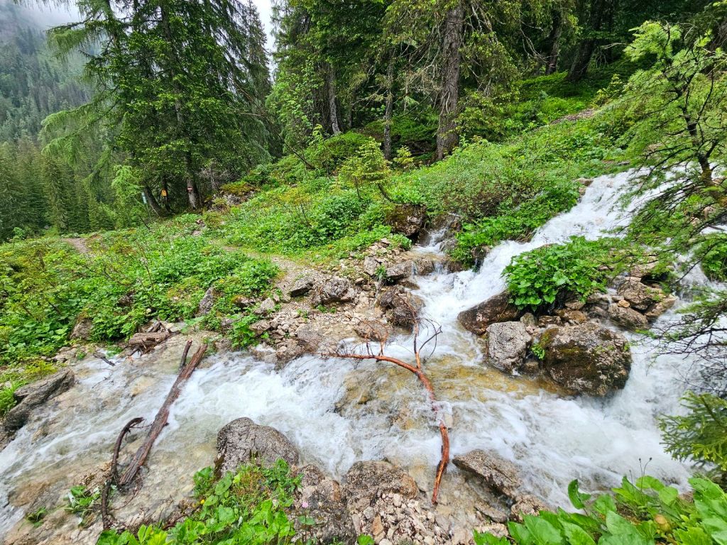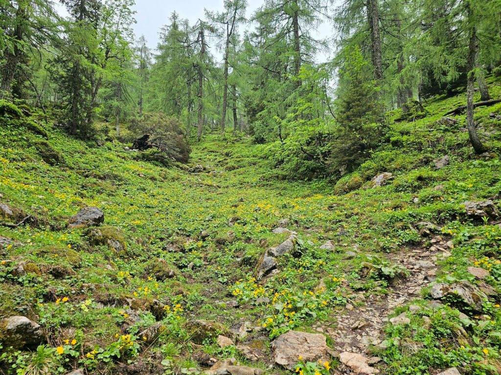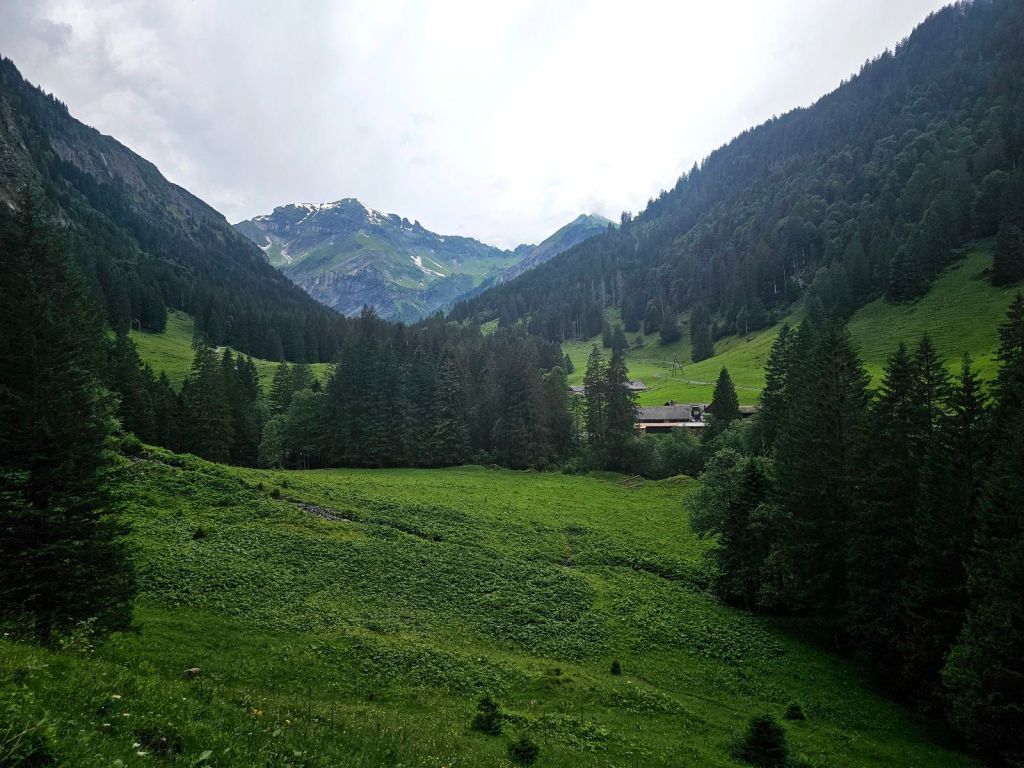 Die letzte Stunde zur Alp Siez ist dann schnell erzählt. Ich nahm die Füße in die Hand und wollte noch trocken ankommen, denn es war schon erkennbar, dass es demnächst noch regnen muss. Der Weg zog sich am Fluss entlang, nie schwierig zu gehen, man musste aber kurz vor Schluss noch eine richtige Rampe hoch, die da irgendwie völlig unnötig wirkte. Komische Natur… Und so war ich Punkt 3 an der Alp Siez, meinen heutigen Schlafplatz.