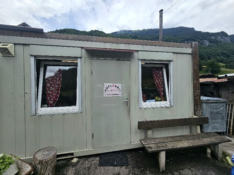Es ging weiter das Tal hoch, im letzten kleinen Dorf namens Weisstannen wurde ich auf ein nettes Schild namens „Hoflädeli“ aufmerksam. Kurz reingeschaut, gab es dort kühle Getränke zur Selbstbedienung. Da wurde natürlich zugeschlagen, so eine kühle Limo ist bei den warmen Temperaturen einfach ein Genuss.