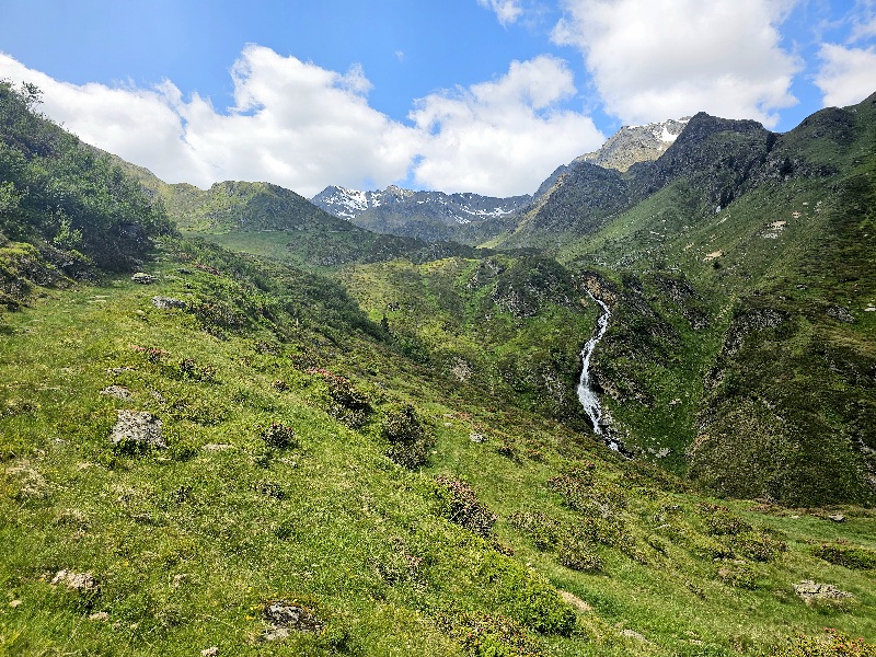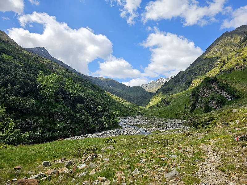 Einige Kilometer ging es nun leicht ansteigend durch dieses schöne Tal, vorbei an Kuhherden, die sich prominent auf dem Weg platziert hatten. Weiter oben wurden die Blicke auf die umliegenden Berge immer schöner.