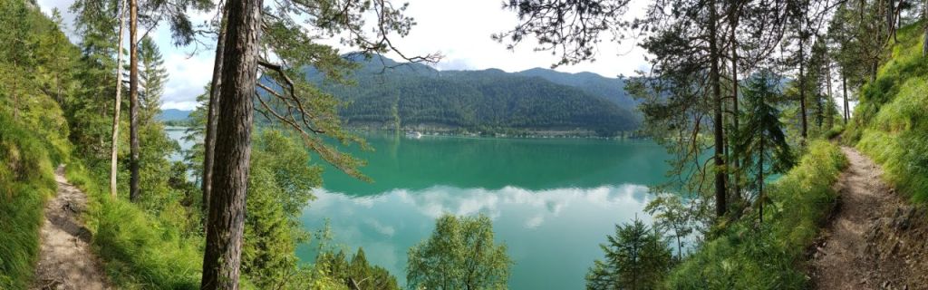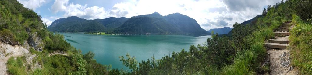 In der folgenden Nacht zog ein heftiger Sturm über Bayern, der zahlreiche Bäume entwurzelte und meinen Weg stark verkomplizierte, da dieser teilweise nicht mehr passierbar war. So ging es querfeldein durch den Wald, teilweise schüttete es noch stark, ein richtiger Sahnetag zum Wandern. Vom zauberhaften Sylveinsteinsee ging es nun weiter nach Österreich zum Achensee, ein hübscher 30km-Marsch bei brütender Hitze – aber der Achensee lohnt jede Anstrengung. Am Folgetag wurde über einen kleinen Steig am Rand des Sees dieser quasi umrundet – zauberhafte Blicke inklusive.