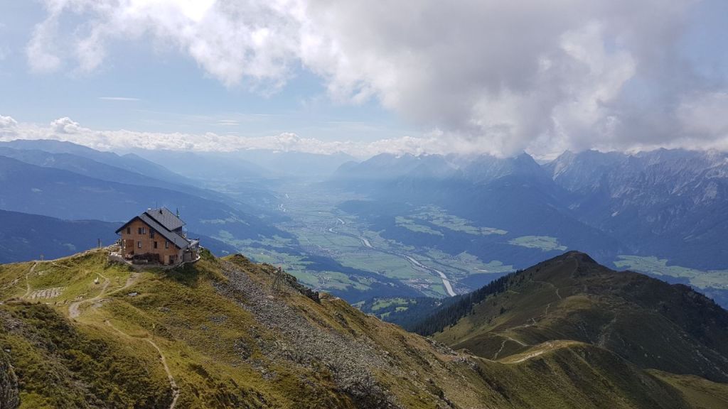Nun folgte der erste kleine Transfer, um das Inntal zu überwinden und dann hinauf zur Kellerjochhütte. Diese liegt wunderschön auf einem vorgelagerten Gipfel und bietet ein traumhaftes Panorama.