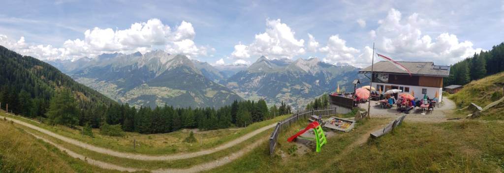 Also Rucksack geschultert und weiter hoch. Weiterhin im guten Tempo erreichte ich dann die wunderschön gelegene Hochalm am Fuß des Hochwart. Ein wundervolles Panorama lässt sich hier begutachten – Sarntaler Alpen, Texelgruppe, einfach grandios. Dazu Sonnenseite, ein traumhafter Platz hier oben.
