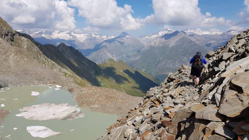 Zum Glück war der Folgetag etwas kürzer, da dieser Etappe definitiv seine Spuren hinterlassen hatte. Bis zur Lasörlinghütte (am namensgebenden Berg Lasörling gelegen, der einzige 3000er des Bergkamm) war es nicht so weit – frühes Ankommen, Mittagsschläfchen und Kraft tanken war angesagt. Denn der Folgetag wies mit dem Bergertörl auf 2.850 Meter Höhe ein durchaus respektables Hindernis auf, wobei der steile Anstieg nicht der größte Knackpunkt war. Oben angekommen genossen wir mit einigen Mitwanderern die gigantische Aussicht.