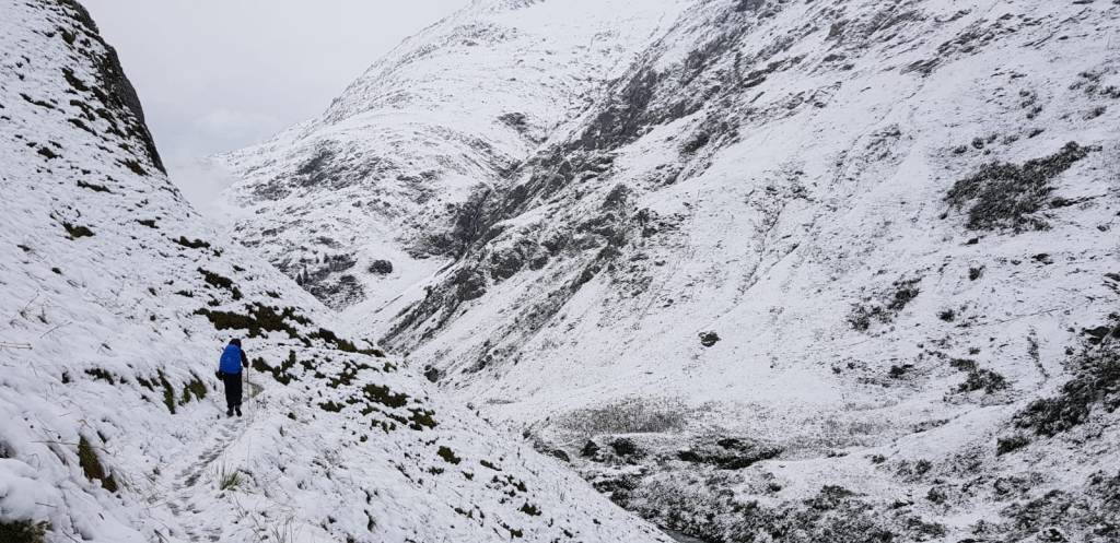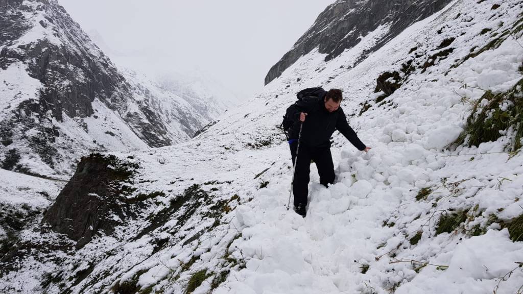 Ab gut 2.300 Meter Höhe wurden dann aus ein paar kleinen Schneefeldern nun riesig große. Und der Wanderweg war größtenteils nicht mehr sichtbar, da er unter den Schneemassen verborgen lag. Zu Beginn konnte ich um diese noch herumkraxeln, was zwar anstrengend, aber machbar war. Aber irgendwann steht man dann vor 20 Meter Schnee und kann nix anderes mehr machen, als sich rüber zu wagen. Direkt am ersten Tag kamen dann die Grödel (eine Art Spikes zum umschnallen für die Füße) zum Einsatz, damit wenigstens die Gefahr des Rutschens minimiert wurde. Langsam auf den Schnee drauf, erstmal bis zur Wade in kurzen Hosen eingesunken. Dann wurde der Schnee härter, ich wagte einige Schritte mehr und zack… bis zur Hüfte im Schnee drin 😀. Also wieder raus und nun auf allen Vierer weiter. Alle Gliedmaßen nun im Schnee versunken und irgendwie bis zum nächsten Felsen robben.