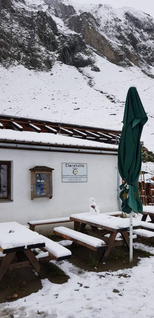 Der Weiterweg wurde aufgrund von Wetterkapriolen etwas geändert, so dass wir erstmal abstiegen, um dann am Ende noch zur wärmstens empfohlenen Clara-Hütte zur gelangen, wo wir noch zwei Nächte verbrachten. Eine Hütte wie ein Traum – wir wurden wärmstens schon beim Empfang begrüßt, die Zimmer aus Zirbenholz dufteten unglaublich. Und nach einer kleinen Tageswanderung wollten wir dann wieder in den Abstieg – um festzustellen, dass es über Nacht im August einen kompletten Wintereinbruch gegeben hatte.